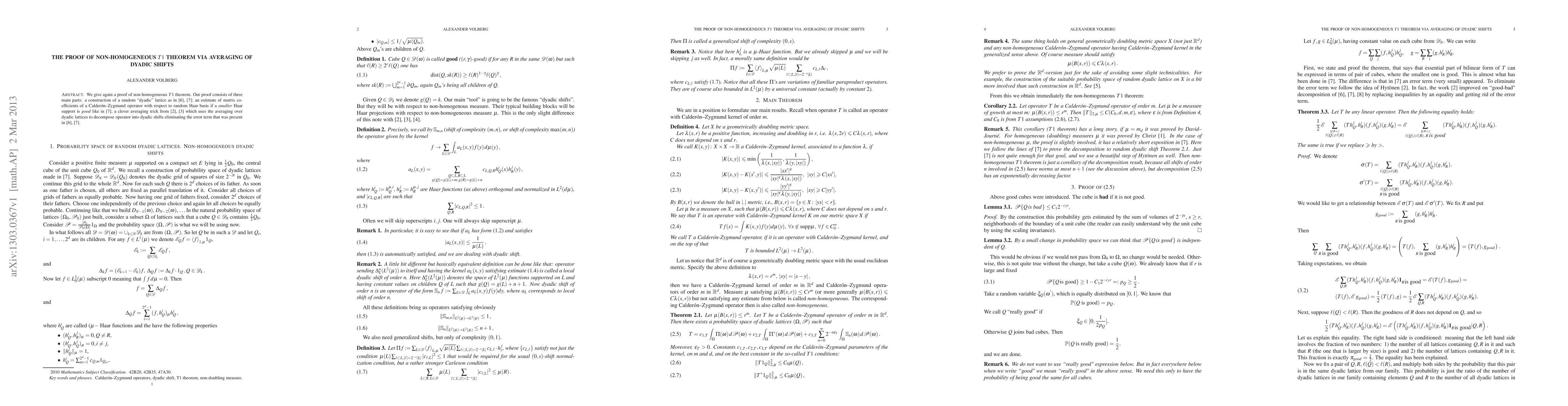 We give again a proof of non-homogeneous T1 theorem. Our proof consists of three main parts: a construction of a random dyadic lattice; an estimate of matrix coefficients of a Calder\'on--Zygmund operator with respect to random Haar basis if a smaller Haar support is good; a clever averaging trick from Hyt\"onen's papers which uses the averaging over dyadic lattices to decompose operator into dyadic shifts eliminating the error term that was present in the previous proofs by Nazarov--Treil--Volberg.