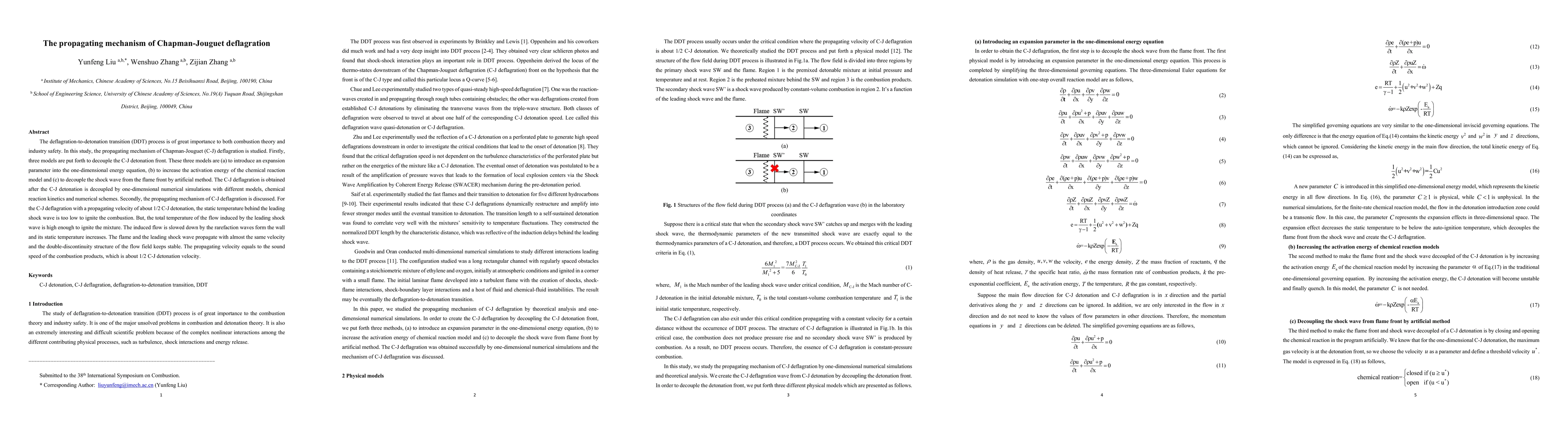 The deflagration-to-detonation transition (DDT) process is of great importance to both combustion theory and industry safety. In this study, the propagating mechanism of Chapman-Jouguet (C-J) deflagration is studied. Firstly, three models are put forth to decouple the C-J detonation front. These three models are (a) to introduce an expansion parameter into the one-dimensional energy equation, (b) to increase the activation energy of the chemical reaction model and (c) to decouple the shock wave from the flame front by artificial method. The C-J deflagration is obtained after the C-J detonation is decoupled by one-dimensional numerical simulations with different models, chemical reaction kinetics and numerical schemes. Secondly, the propagating mechanism of C-J deflagration is discussed. For the C-J deflagration with a propagating velocity of about 1/2 C-J detonation, the static temperature behind the leading shock wave is too low to ignite the combustion. But, the total temperature of the flow induced by the leading shock wave is high enough to ignite the mixture. The induced flow is slowed down by the rarefaction waves form the wall and its static temperature increases. The flame and the leading shock wave propagate with almost the same velocity and the double-discontinuity structure of the flow field keeps stable. The propagating velocity equals to the sound speed of the combustion products, which is about 1/2 C-J detonation velocity.
