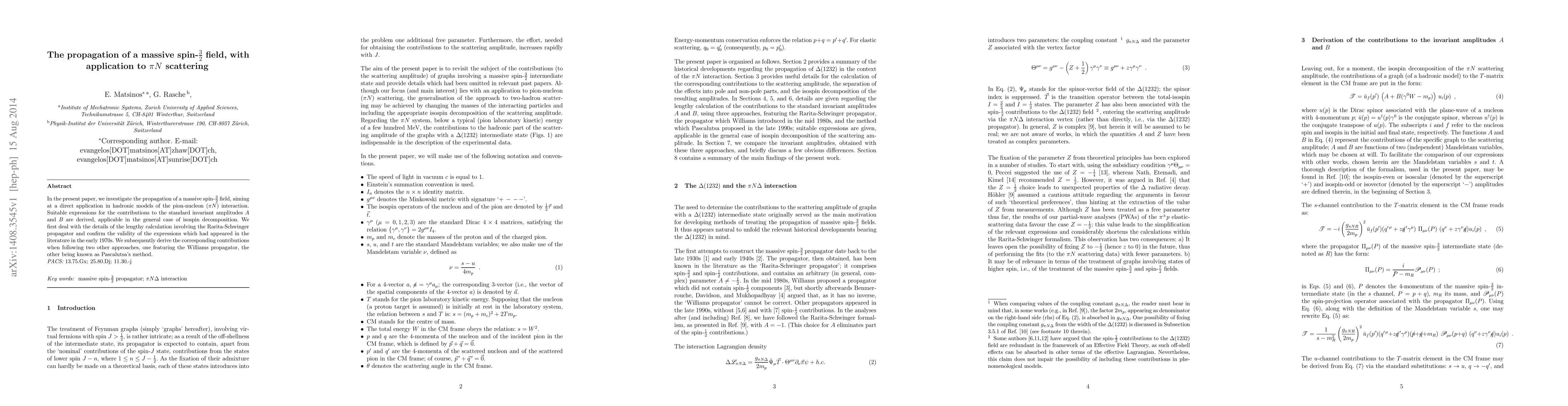 This paper investigates the propagation of a massive spin-$\frac{3}{2}$ field, deriving expressions for $\pi N$ scattering invariant amplitudes $A$ and $B$. It confirms existing results using the Rarita-Schwinger propagator and explores alternative methods, including the Williams propagator and Pascalutsa's approach.