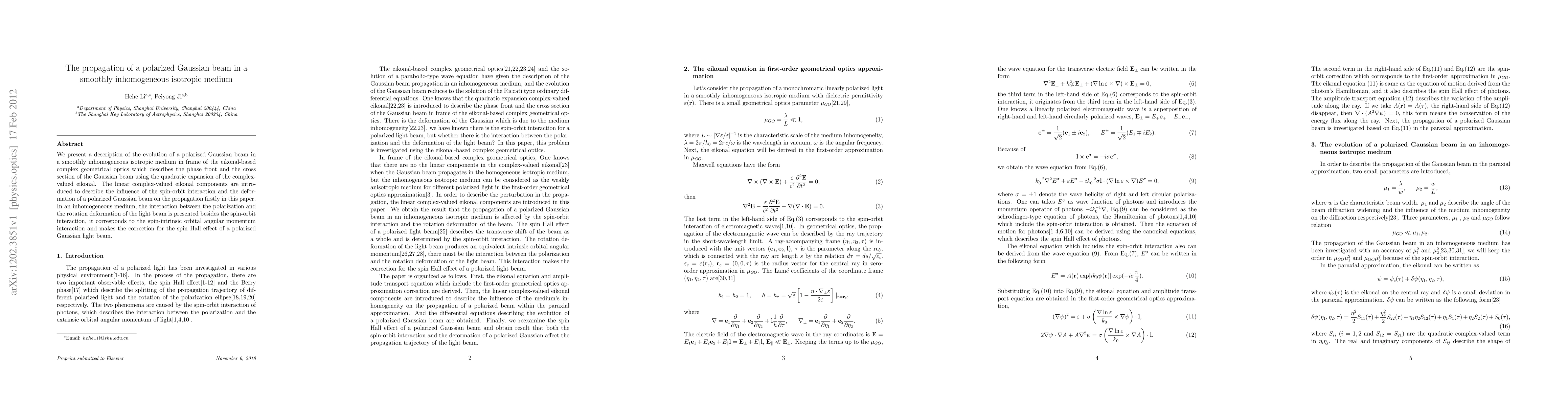 This paper describes the evolution of a polarized Gaussian beam in a smoothly inhomogeneous isotropic medium using eikonal-based complex geometrical optics. It introduces linear complex-valued eikonals to account for spin-orbit interaction and deformation, highlighting the spin-intrinsic orbital angular momentum interaction and correcting for the spin Hall effect.