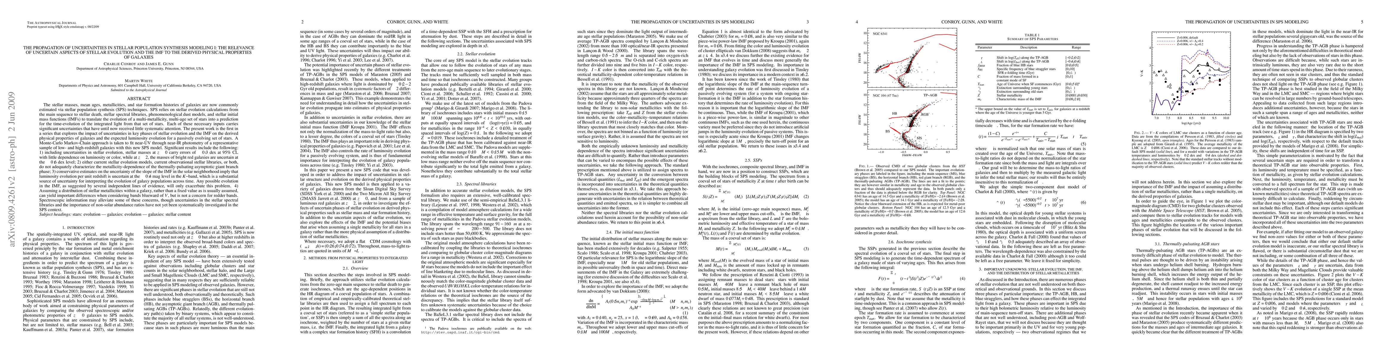 The stellar masses, mean ages, metallicities, and star formation histories of galaxies are now commonly estimated via stellar population synthesis (SPS) techniques. SPS relies on stellar evolution calculations from the main sequence to stellar death, stellar spectral libraries, phenomenological dust models, and stellar initial mass functions (IMFs). The present work is the first in a series that explores the impact of uncertainties in key phases of stellar evolution and the IMF on the derived physical properties of galaxies and the expected luminosity evolution for a passively evolving set of stars. A Monte-Carlo Markov-Chain approach is taken to fit near-UV through near-IR photometry of a representative sample of low- and high-redshift galaxies with this new SPS model. Significant results include the following: 1) including uncertainties in stellar evolution, stellar masses at z~0 carry errors of ~0.3 dex at 95% CL with little dependence on luminosity or color, while at z~2, the masses of bright red galaxies are uncertain at the ~0.6 dex level; 2) either current stellar evolution models, current observational stellar libraries, or both, do not adequately characterize the metallicity-dependence of the thermally-pulsating asymptotic giant branch phase; 3) conservative estimates on the uncertainty of the slope of the IMF in the solar neighborhood imply that luminosity evolution per unit redshift is uncertain at the ~0.4 mag level in the K-band, which is a substantial source of uncertainty for interpreting the evolution of galaxy populations across time; 4) The more plausible assumption of a distribution of stellar metallicities, rather than a fixed value as is usually assumed, can have significant effects on the interpretation of colors blueward of the V-band. (ABRIDGED)