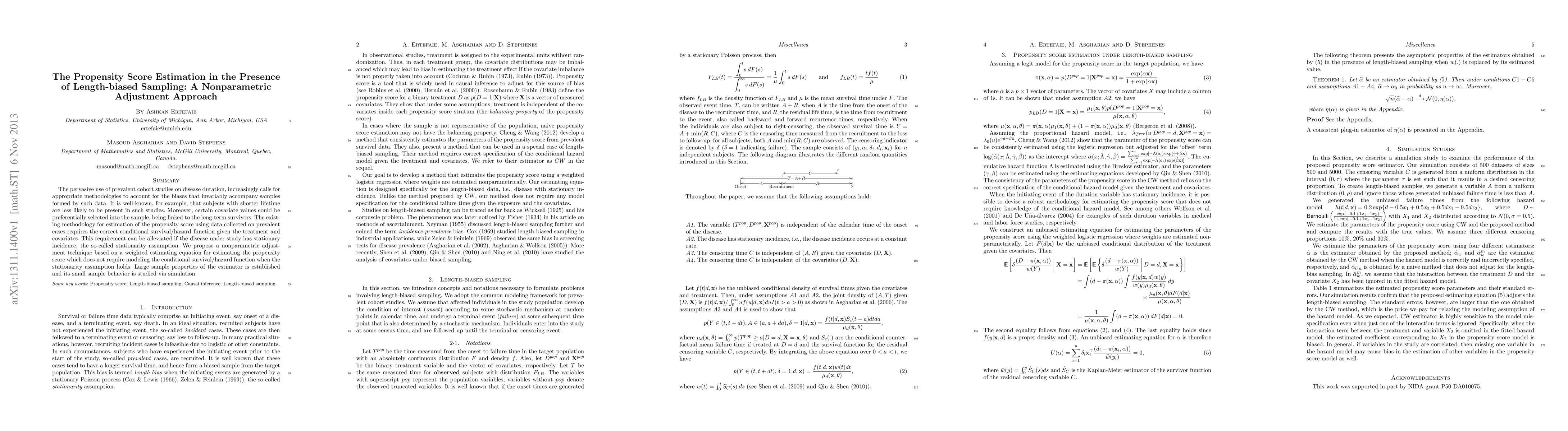 The pervasive use of prevalent cohort studies on disease duration, increasingly calls for appropriate methodologies to account for the biases that invariably accompany samples formed by such data. It is well-known, for example, that subjects with shorter lifetime are less likely to be present in such studies. Moreover, certain covariate values could be preferentially selected into the sample, being linked to the long-term survivors. The existing methodology for estimation of the propensity score using data collected on prevalent cases requires the correct conditional survival/hazard function given the treatment and covariates. This requirement can be alleviated if the disease under study has stationary incidence, the so-called stationarity assumption. We propose a nonparametric adjustment technique based on a weighted estimating equation for estimating the propensity score which does not require modeling the conditional survival/hazard function when the stationarity assumption holds. Large sample properties of the estimator is established and its small sample behavior is studied via simulation.
