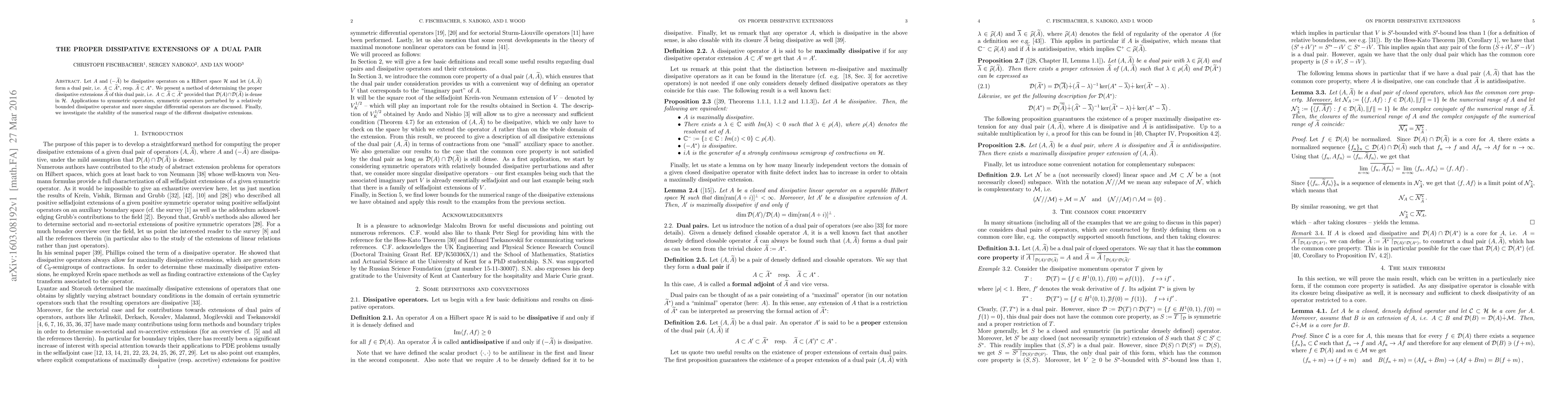 Let $A$ and $(-\widetilde{A})$ be dissipative operators on a Hilbert space $\mathcal{H}$ and let $(A,\widetilde{A})$ form a dual pair, i.e. $A\subset\widetilde{A}^*$, resp.\ $\widetilde{A}\subset A^*$. We present a method of determining the proper dissipative extensions $\widehat{A}$ of this dual pair, i.e. $A\subset \widehat{A}\subset\widetilde{A}^*$ provided that $\mathcal{D}(A)\cap\mathcal{D}(\widetilde{A})$ is dense in $\mathcal{H}$. Applications to symmetric operators, symmetric operators perturbed by a relatively bounded dissipative operator and more singular differential operators are discussed. Finally, we investigate the stability of the numerical range of the different dissipative extensions.
