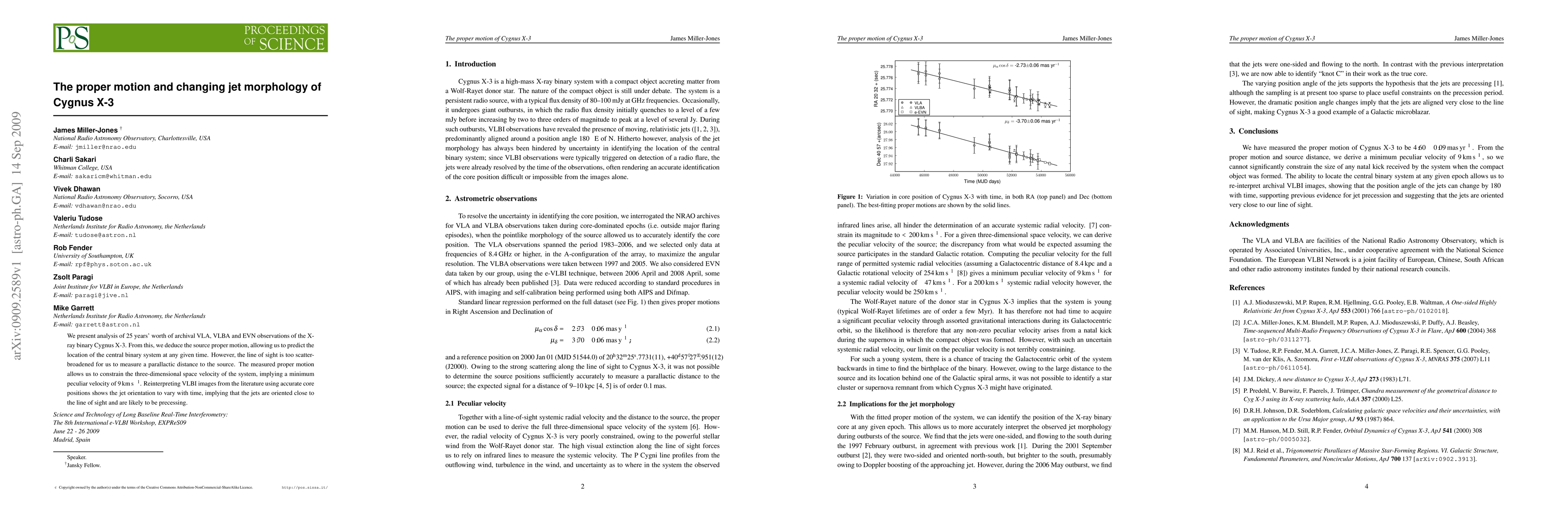 We present analysis of 25 years' worth of archival VLA, VLBA and EVN observations of the X-ray binary Cygnus X-3. From this, we deduce the source proper motion, allowing us to predict the location of the central binary system at any given time. However, the line of sight is too scatter-broadened for us to measure a parallactic distance to the source. The measured proper motion allows us to constrain the three-dimensional space velocity of the system, implying a minimum peculiar velocity of 9 km/s. Reinterpreting VLBI images from the literature using accurate core positions shows the jet orientation to vary with time, implying that the jets are oriented close to the line of sight and are likely to be precessing.