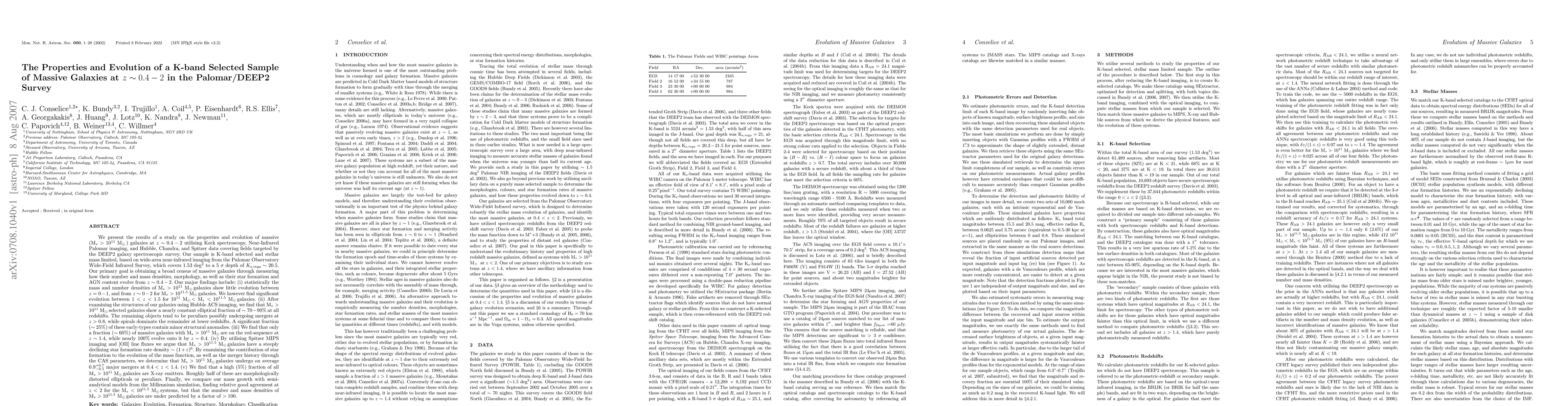 We present the results of a study on the properties and evolution of massive (M_* > 10^11 M_0) galaxies at z~0.4 - 2 utilising Keck spectroscopy, near-Infrared Palomar imaging, and Hubble, Chandra, and Spitzer data covering fields targeted by the DEEP2 galaxy spectroscopic survey. Our sample is K band selected based on wide-area NIR imaging from the Palomar Observatory Wide-Field Infrared Survey, which covers 1.53 deg^2 to K_s,vega~20.5. Our major findings include: (i) statistically the mass and number densities of M_* > 10^11 M_0 galaxies show little evolution between z = 0 - 1, and from z ~ 0 - 2 for M_* > 10^11.5 M_0 galaxies. (ii) Using Hubble ACS imaging, we find that M_* > 10^11 selected galaxies show a nearly constant elliptical fraction of ~70-90% at all redshifts. The remaining objects are peculiars possibly undergoing mergers at z > 0.8, while spirals dominate the remainder at lower redshifts. (iii) We find that only a fraction (~60%) of massive galaxies with M_* > 10^11 M_0 are on the red-sequence at z~1.4, while nearly 100% evolve onto it by z~0.4. (iv) By utilising Spitzer MIPS imaging and [OII] line fluxes we argue that M_* > 10^11.5 galaxies have a steeply declining star formation rate density ~(1+z)^6. By examining the contribution of star formation to the evolution of the mass function, as well as the merger history through the CAS parameters, we determine that M_* >10^11 M_0 galaxies undergo on average 0.9^+0.7_-0.5 major mergers at 0.4 < z < 1.4. (v) A high (5%) fraction of all M_* > 10^11 M_0 galaxies are X-ray emitters. Roughly half of these are morphologically distorted ellipticals or peculiars. We compare our results with the Millennium simulation, finding that the number and mass densities of M_* > 10^11.5 M_0 galaxies are under predicted by a factor of > 100.