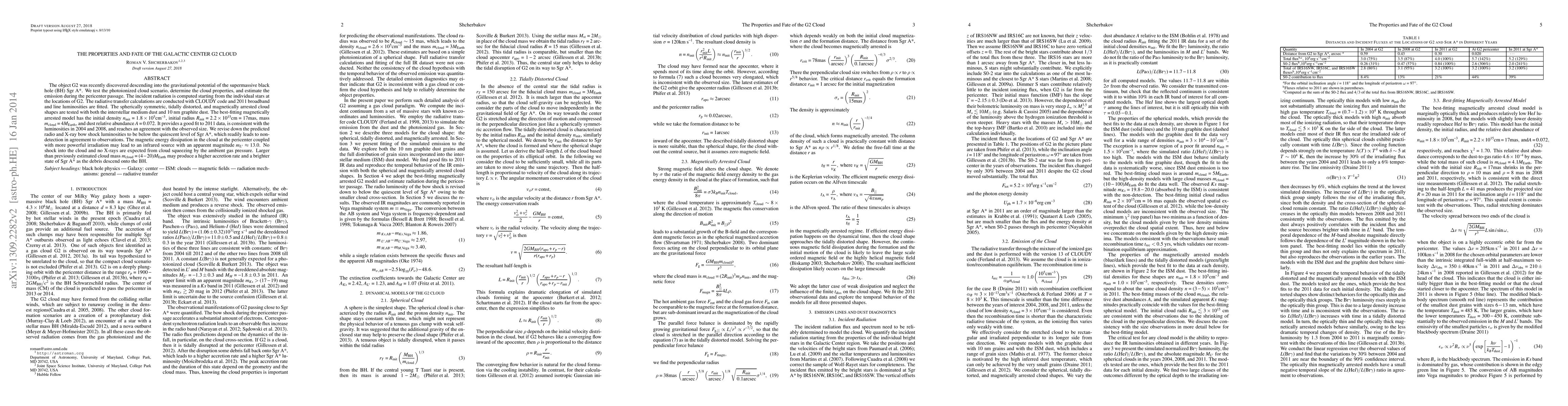 The G2 cloud's properties and fate were studied using radiative transfer calculations, revealing a best-fit model with a magnetic arrested shape that matches observed data on size and luminosity, and predicts an infrared source with apparent magnitude 13.0 after pericenter passage.