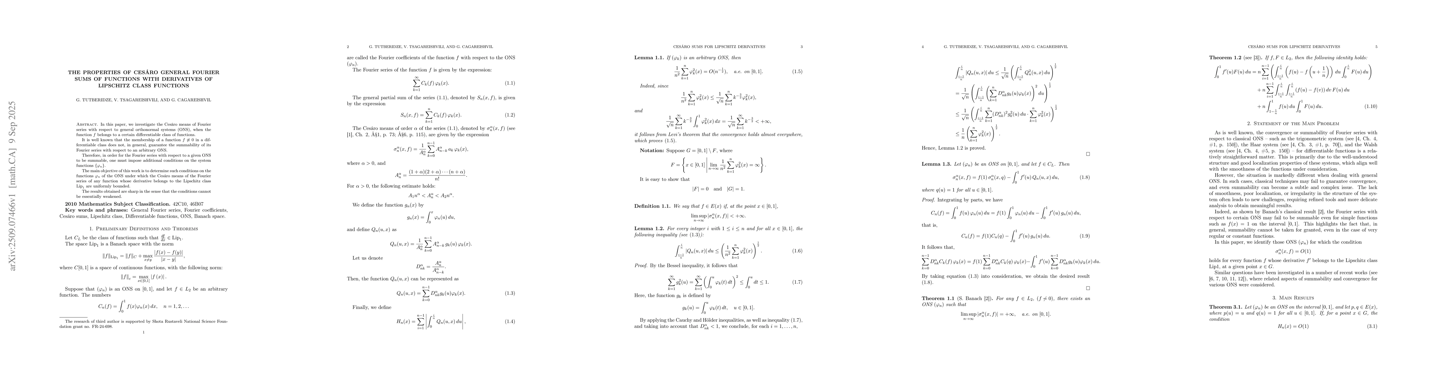 In this paper, we investigate the Ces\'aro means of Fourier series with respect to general orthonormal systems (ONS), when the function \( f \) belongs to a certain differentiable class of functions. It is well known that the membership of a function \( f \not\equiv 0 \) in a differentiable class does not, in general, guarantee the summability of its Fourier series with respect to an arbitrary ONS. Therefore, in order for the Fourier series with respect to a given ONS to be summable, one must impose additional conditions on the system functions \( \{\varphi_n\} \). The main objective of this work is to determine such conditions on the functions \( \varphi_n \) of the ONS under which the Ces\'aro means of the Fourier series of any function whose derivative belongs to the Lipschitz class \( \mathrm{Lip}_1 \) are uniformly bounded. The results obtained are sharp in the sense that the conditions cannot be essentially weakened.