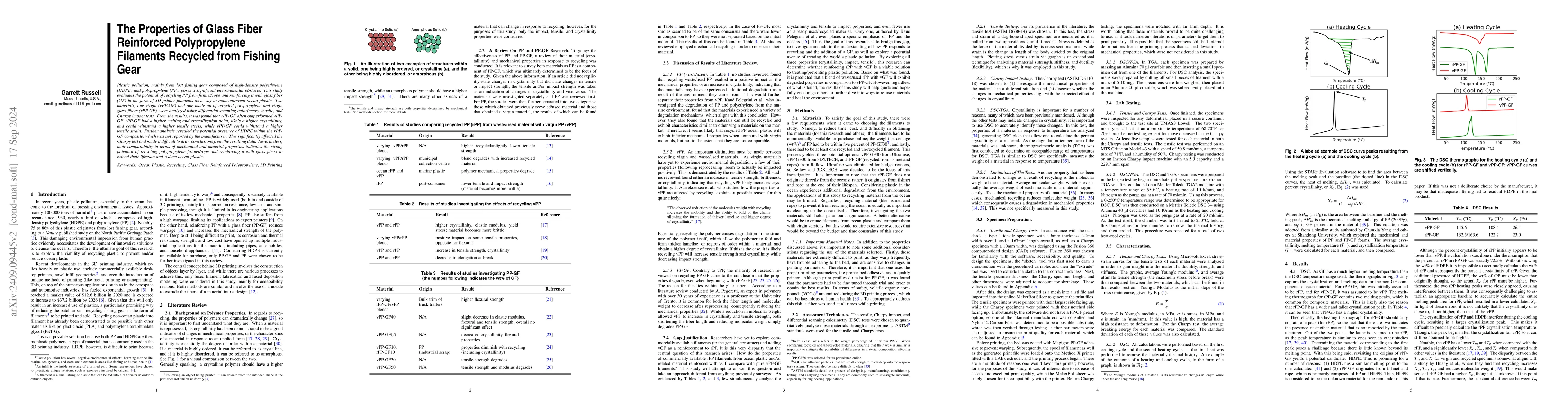 This study investigates recycling polypropylene from fishing gear reinforced with glass fiber to combat ocean plastic pollution. Results show that recycled PP with glass fibers (rPP-GF) often outperforms virgin PP (vPP-GF) in mechanical properties, suggesting strong potential for extending the material's lifespan and reducing marine debris.