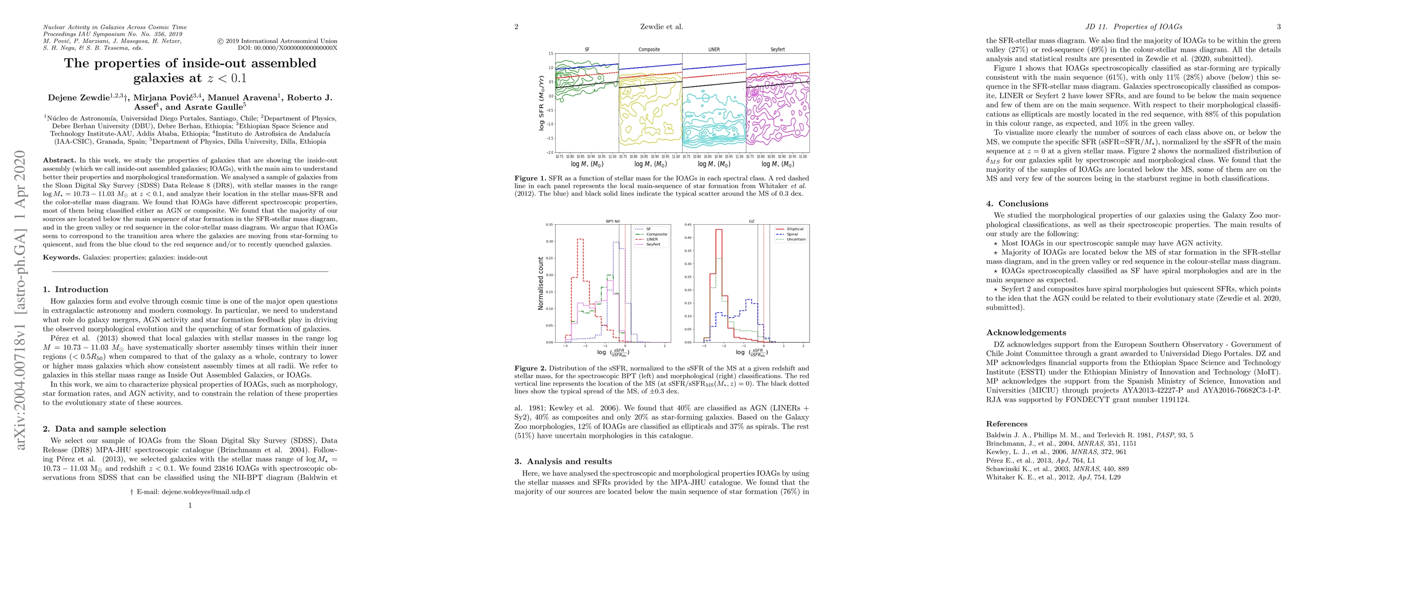 In this work, we study the properties of galaxies that are showing the inside-out assembly (which we call inside-out assembled galaxies; IOAGs), with the main aim to understand better their properties and morphological transformation. We analysed a sample of galaxies from the Sloan Digital Sky Survey (SDSS) Data Release 8 (DR8), with stellar masses in the range $\log M_{\star}=10.73-11.03$ $M_{\odot{}}$ at $z < 0.1$, and analyze their location in the stellar mass-SFR and the color-stellar mass diagram. We found that IOAGs have different spectroscopic properties, most of them being classified either as AGN or composite. We found that the majority of our sources are located below the main sequence of star formation in the SFR-stellar mass diagram, and in the green valley or red sequence in the color-stellar mass diagram. We argue that IOAGs seem to correspond to the transition area where the galaxies are moving from star-forming to quiescent, and from the blue cloud to the red sequence and/or to recently quenched galaxies.