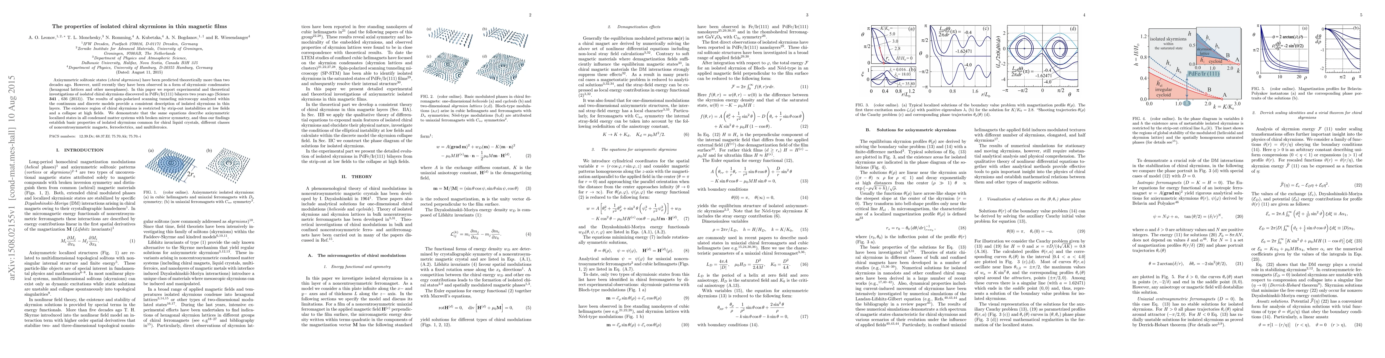 Axisymmetric solitonic states (chiral skyrmions) have been predicted theoretically more than two decades ago. However, until recently they have been observed in a form of skyrmionic condensates (hexagonal lattices and other mesophases). In this paper we report experimental and theoretical investigations of isolated chiral skyrmions discovered in PdFe/Ir(111) bilayers two years ago (Science 341 , 636 (2013)). The results of spin-polarized scanning tunneling microscopy analyzed within the continuum and discrete models provide a consistent description of isolated skyrmions in thin layers. The existence region of chiral skyrmions is restricted by strip-out instabilities at low fields and a collapse at high fields. We demonstrate that the same equations describe axisymmetric localized states in all condensed matter systems with broken mirror symmetry, and thus our findings establish basic properties of isolated skyrmions common for chiral liquid crystals, different classes of noncentrosymmetric magnets, ferroelectrics, and multiferroics.
