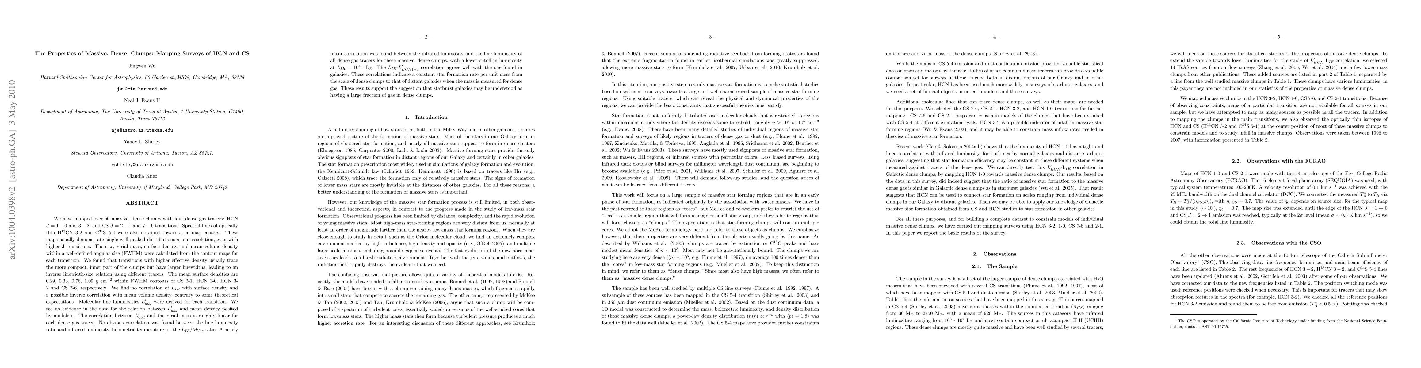 The research mapped over 50 massive, dense clumps using four dense gas tracers: HCN J=1-0 and 3-2; and CS J=2-1 and 7-6. Spectral lines of optically thin H¹³CN 3-2 and C³⁴S 5-4 were also obtained towards the map centers.