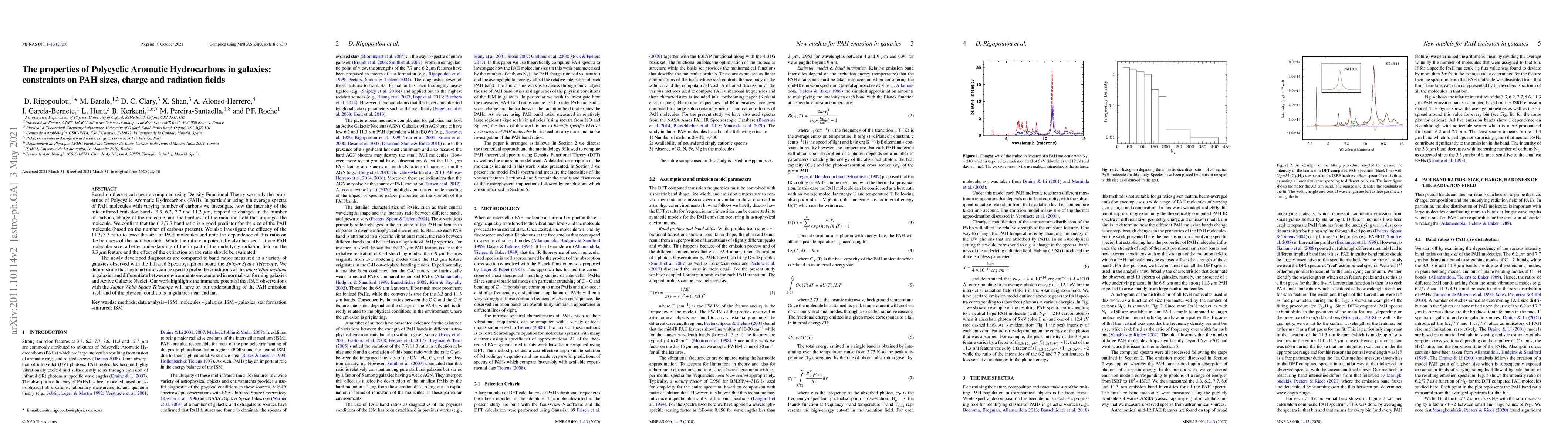 Based on theoretical spectra computed using Density Functional Theory we study the properties of Polycyclic Aromatic Hydrocarbons (PAH). In particular using bin-average spectra of PAH molecules with varying number of carbons we investigate how the intensity of the mid-infrared emission bands, 3.3, 6.2, 7.7 and 11.3 microns, respond to changes in the number of carbons, charge of the molecule, and the hardness of the radiation field that impinges the molecule. We confirm that the 6.2/7.7 band ratio is a good predictor for the size of the PAH molecule (based on the number of carbons present). We also investigate the efficacy of the 11.3/3.3 ratio to trace the size of PAH molecules and note the dependence of this ratio on the hardness of the radiation field. While the ratio can potentially also be used to trace PAH molecular size, a better understanding of the impact of the underlying radiation field on the 3.3 microns feature and the effect of the extinction on the ratio should be evaluated. The newly developed diagnostics are compared to band ratios measured in a variety of galaxies observed with the Infrared Spectrograph on board the Spitzer Space Telescope. We demonstrate that the band ratios can be used to probe the conditions of the interstellar medium in galaxies and differentiate between environments encountered in normal star forming galaxies and Active Galactic Nuclei. Our work highlights the immense potential that PAH observations with the James Webb Space Telescope will have on our understanding of the PAH emission itself and of the physical conditions in galaxies near and far.