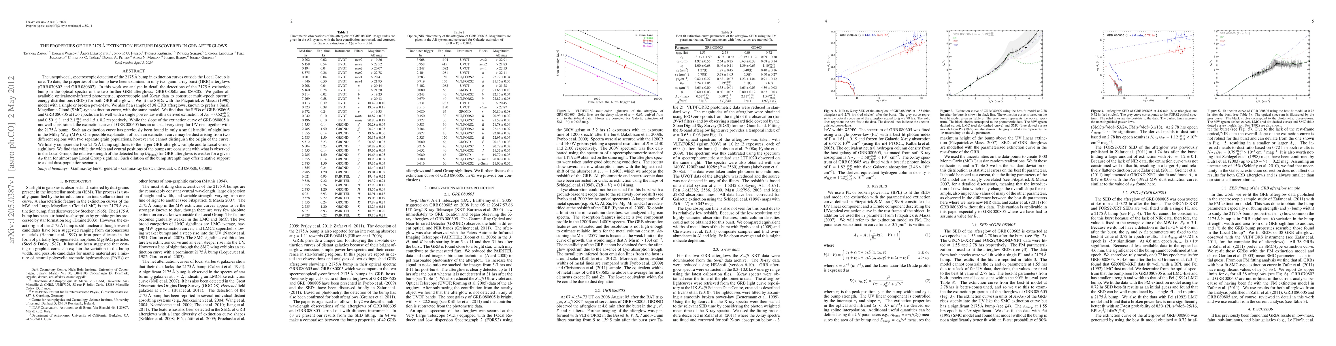The unequivocal, spectroscopic detection of the 2175 bump in extinction curves outside the Local Group is rare. To date, the properties of the bump have been examined in only two GRB afterglows (GRB 070802 and GRB 080607). In this work we analyse in detail the detections of the 2175 extinction bump in the optical spectra of the two further GRB afterglows: GRB 080605 and 080805. We gather all available optical/NIR photometric, spectroscopic and X-ray data to construct multi-epoch SEDs for both GRB afterglows. We fit the SEDs with the Fitzpatrick & Massa (1990) model with a single or broken PL. We also fit a sample of 38 GRB afterglows, known to prefer a SMC-type extinction curve, with the same model. We find that the SEDs of GRB 080605 and GRB 080805 at two epochs are fit well with a single PL with a derived extinction of A_V = 0.52(+0.13 -0.16) and 0.50 (+0.13 -0.10), and 2.1(+0.7-0.6) and 1.5+/-0.2 respectively. While the slope of the extinction curve of GRB 080805 is not well-constrained, the extinction curve of GRB 080605 has an unusual very steep far-UV rise together with the 2175 bump. Such an extinction curve has previously been found in only a small handful of sightlines in the MW. One possible explanation of such an extinction curve may be dust arising from two different regions with two separate grain populations, however we cannot distinguish the origin of the curve. We finally compare the four 2175 bump sightlines to the larger GRB afterglow sample and to Local Group sightlines. We find that while the width and central positions of the bumps are consistent with what is observed in the Local Group, the relative strength of the detected bump (A_bump) for GRB afterglows is weaker for a given A_V than for almost any Local Group sightline. Such dilution of the bump strength may offer tentative support to a dual dust-population scenario.