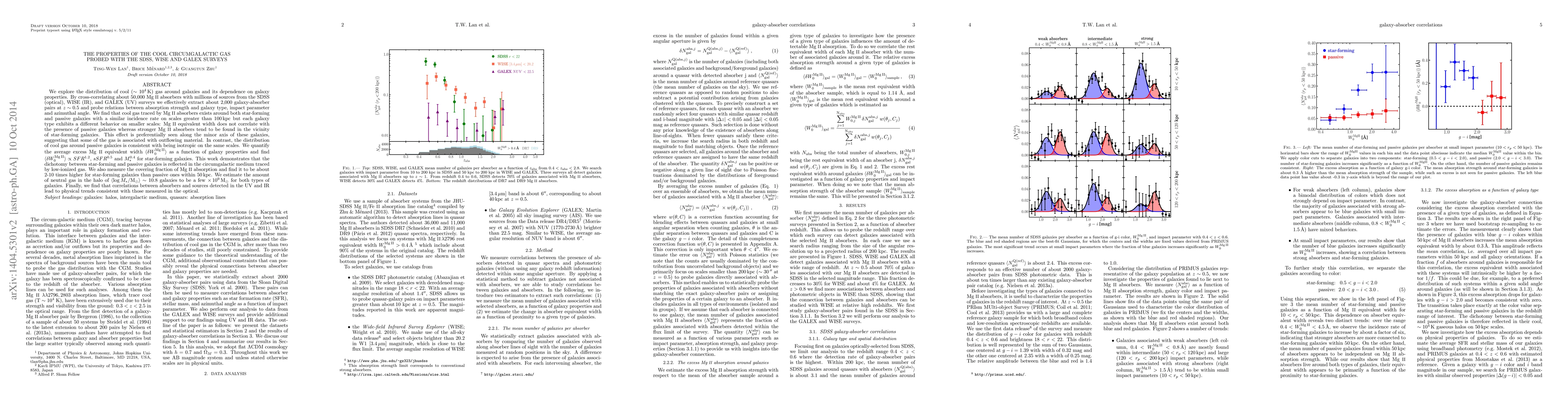 The study investigates cool (~$10^4$K) gas distribution around galaxies, finding similar incidence of MgII-traced gas around star-forming and passive galaxies at >100 kpc. However, stronger MgII absorbers are associated with star-forming galaxies, preferentially along their minor axes, hinting at outflowing material. The research also reveals that $<delta W_{0}^{ m MgII}>$ correlates with star-forming rate, specific star-forming rate, and stellar mass. The covering fraction of MgII absorption is higher for star-forming galaxies within 50 kpc, and the neutral gas mass in halos of ~10^10 M☉ galaxies is estimated similarly for both galaxy types. Correlations between absorbers and sources in UV and IR data mirror optical trends.