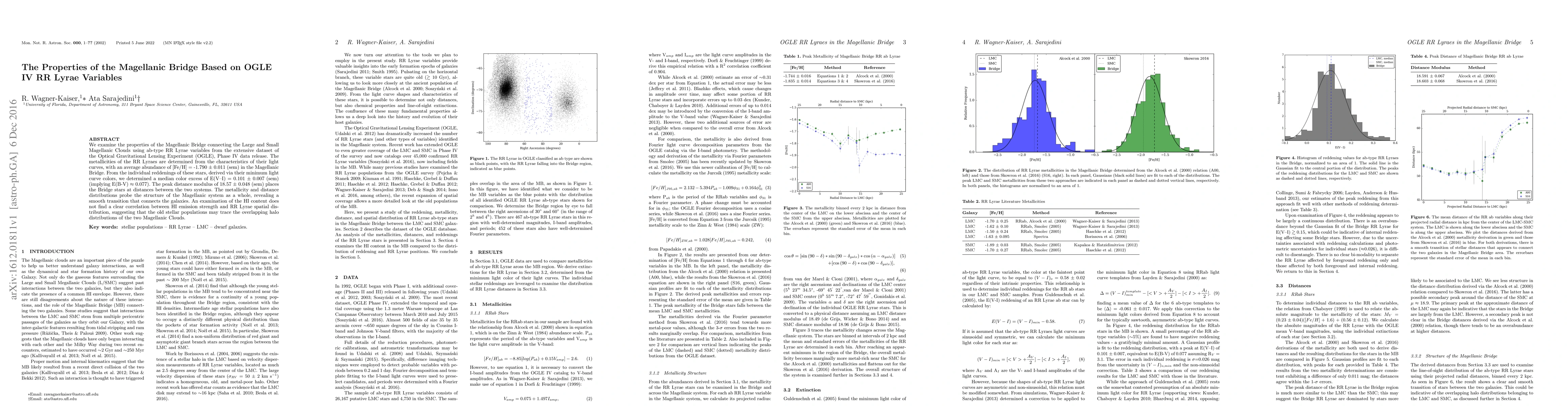 This paper investigates the properties of the Magellanic Bridge using RR Lyrae variables from OGLE IV, finding an average metallicity of [Fe/H] = -1.790 +/- 0.011 and a peak distance modulus of 18.57 +/- 0.048, indicating the Bridge stars lie between the Large and Small Magellanic Clouds. The study suggests old stellar populations trace the overlapping halo distributions of the two galaxies.