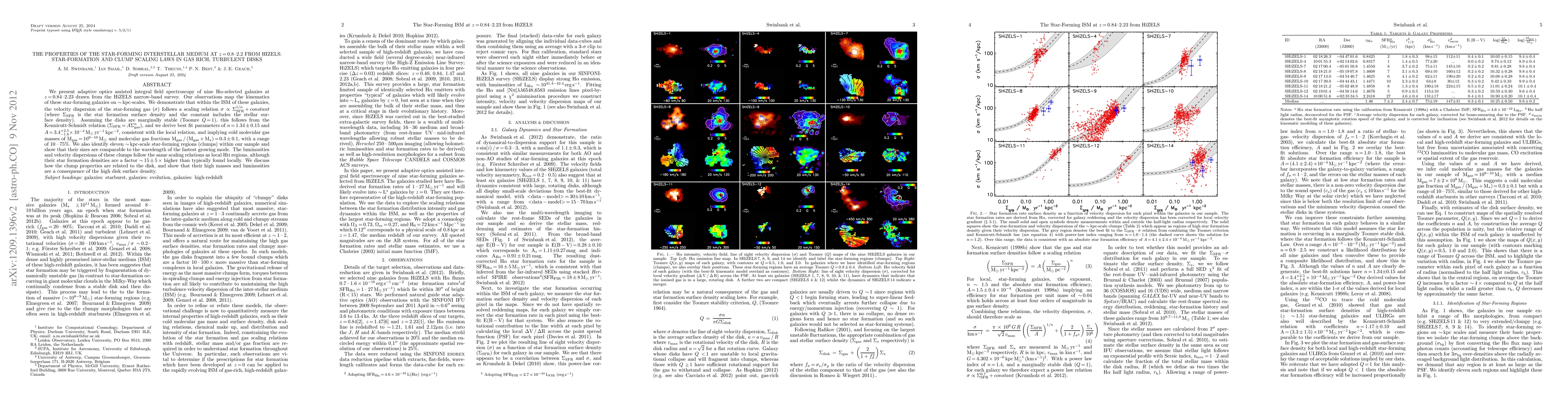 We present adaptive optics assisted integral field spectroscopy of nine Halpha-selected galaxies at z=0.84--2.23 selected from the HiZELS narrow-band survey. Our observations map the star-formation and kinematics of these representative star-forming galaxies on ~kpc-scales. We demonstrate that within the ISM of these galaxies, the velocity dispersion of the star-forming gas (\sigma) follows a scaling relation \sigma\propto\Sigma_SFR^(1/n)+constant (where \Sigma_SFR is the star formation surface density and the constant includes the stellar surface density). Assuming the disks are marginally stable (Toomre Q=1), we show that this follows from the Kennicutt-Schmidt relation (\Sigma_SFR = A\Sigma_gas^n), and we use the data to derive best fit parameters of n=1.34+/-0.15 and A=3.4_(-1.6)^(+2.5)x10^(-4)Mo/yr/kpc^2, consistent with the local relation and implying cold molecular gas masses of M_gas=10^(9-10)Mo and molecular gas fractions M_gas/(M_gas+Mstars)=0.3+/-0.1, with a range of 10-75%. These values confirm the high gas fractions for high-redshift star-forming galaxies, independent of CO-H_2 conversion factor. We also identify eleven ~kpc-scale star-forming regions (clumps) within our sample and show that their sizes are comparable to the wavelength of the fastest growing unstable mode. The luminosities and velocity dispersions of these clumps follow the same scaling relations as local HII regions, although their star formation densities are a factor 15+/-5x higher than typically found locally. We discuss how the clump properties are related to the disk, and show that their high masses and luminosities are a consequence of the high disk surface density.