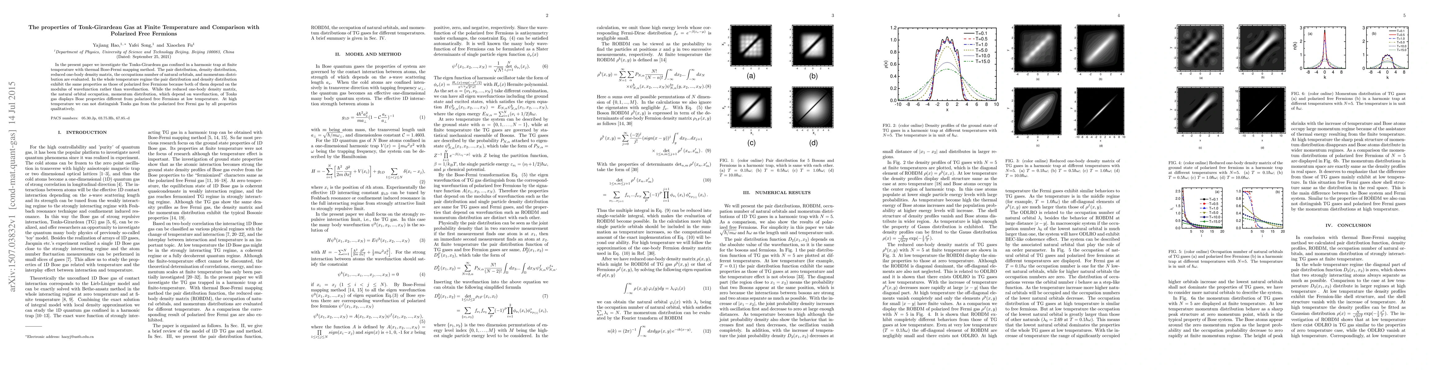 This paper examines Tonks-Girardeau gas in a harmonic trap at finite temperature, revealing that pair and density distributions mimic polarized free Fermions due to their dependence on wavefunction modulus. At low temperatures, the Tonks gas exhibits Bose-like properties in reduced density matrix and momentum distribution, while at high temperatures, it aligns with polarized free Fermions.