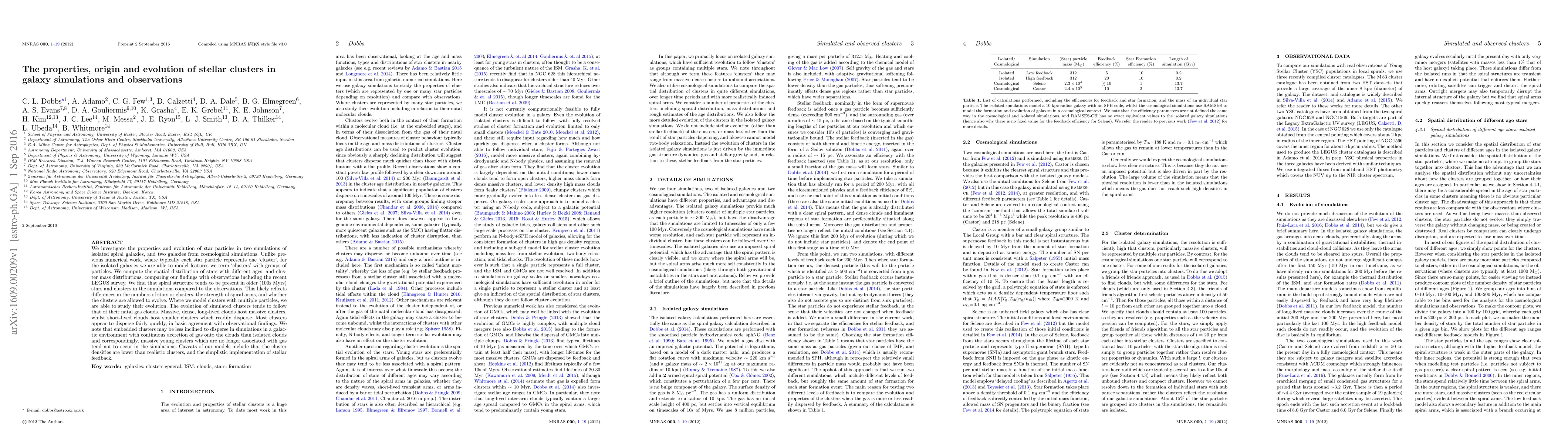 We investigate the properties and evolution of star particles in two simulations of isolated spiral galaxies, and two galaxies from cosmological simulations. Unlike previous numerical work, where typically each star particle represents one `cluster', for the isolated galaxies we are able to model features we term `clusters' with groups of particles. We compute the spatial distribution of stars with different ages, and cluster mass distributions, comparing our findings with observations including the recent LEGUS survey. We find that spiral structure tends to be present in older (100s Myrs) stars and clusters in the simulations compared to the observations. This likely reflects differences in the numbers of stars or clusters, the strength of spiral arms, and whether the clusters are allowed to evolve. Where we model clusters with multiple particles, we are able to study their evolution. The evolution of simulated clusters tends to follow that of their natal gas clouds. Massive, dense, long-lived clouds host massive clusters, whilst short-lived clouds host smaller clusters which readily disperse. Most clusters appear to disperse fairly quickly, in basic agreement with observational findings. We note that embedded clusters may be less inclined to disperse in simulations in a galactic environment with continuous accretion of gas onto the clouds than isolated clouds and correspondingly, massive young clusters which are no longer associated with gas tend not to occur in the simulations. Caveats of our models include that the cluster densities are lower than realistic clusters, and the simplistic implementation of stellar feedback.