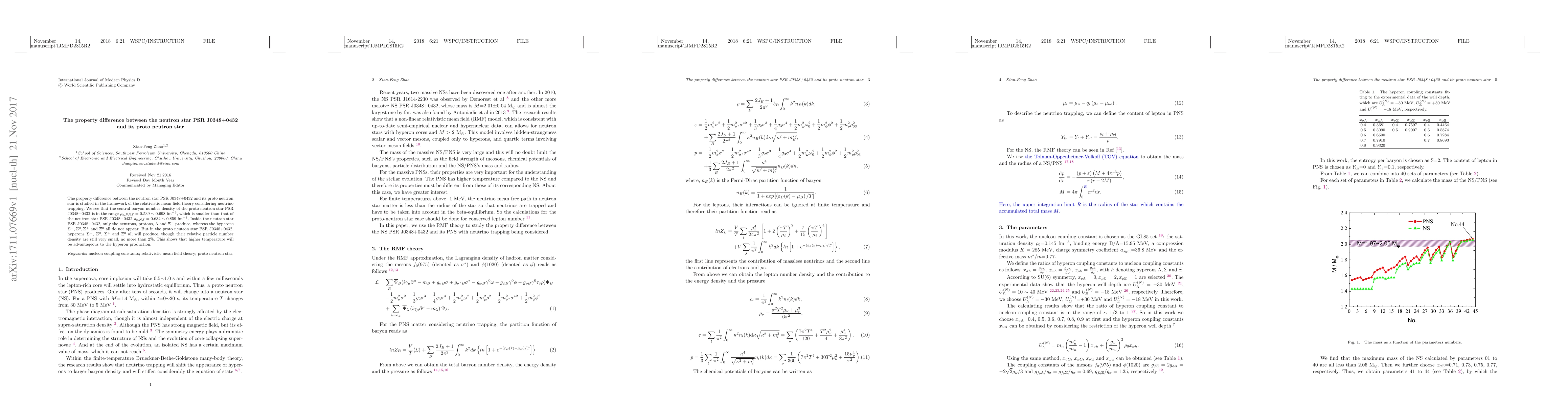 The property difference between the neutron star PSR J0348+0432 and its proto neutron star is studied in the framework of the relativistic mean field theory considering neutrino trapping. We see that the central baryon number density of the proto neutron star PSR J0348+0432 is in the range $\rho_{c, PNS}=0.539\sim0.698$ fm$^{-3}$, which is smaller than that of the neutron star PSR J0348+0432 $\rho_{c, NS}=0.634\sim0.859$ fm$^{-3}$. Inside the neutron star PSR J0348+0432, only the neutrons, protons, $\Lambda$ and $\Xi^{-}$ produce, whereas the hyperons $\Sigma^{-}, \Sigma^{0}, \Sigma^{+}$ and $\Xi^{0}$ all do not appear. But in the proto neutron star PSR J0348+0432, hyperons $\Sigma^{-}$, $\Sigma^{0}$, $\Sigma^{+}$ and $\Xi^{0}$ all will produce, though their relative particle number density are still very small, no more than 2\%. This shows that higher temperature will be advantageous to the hyperon production.