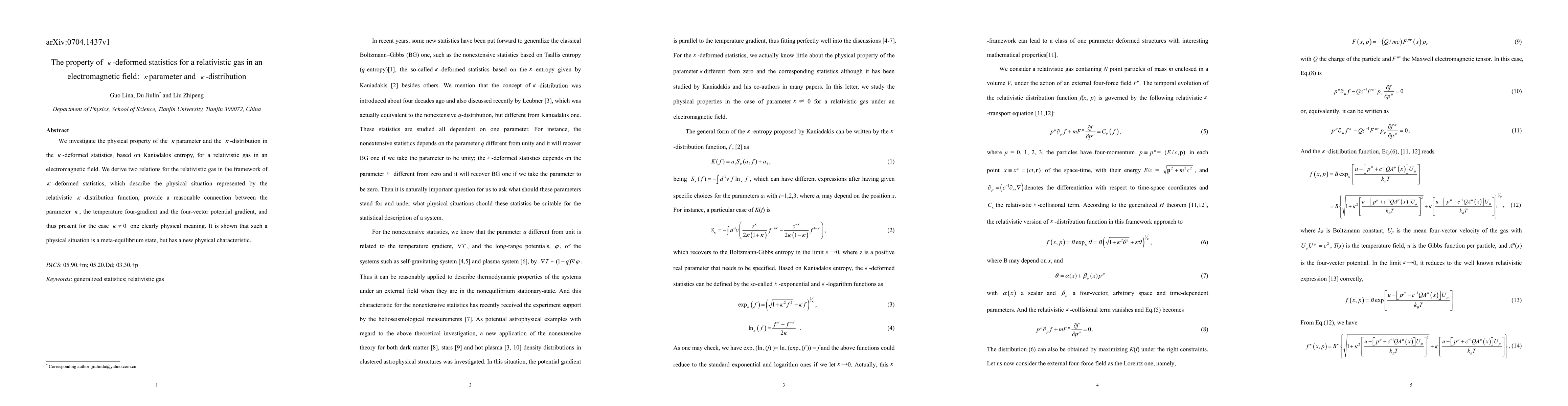 This paper explores the kappa-deformed statistics for relativistic gas in an electromagnetic field, deriving relations that connect the kappa parameter with temperature and electromagnetic field gradients. It reveals a meta-equilibrium state with unique physical characteristics for non-zero kappa values.