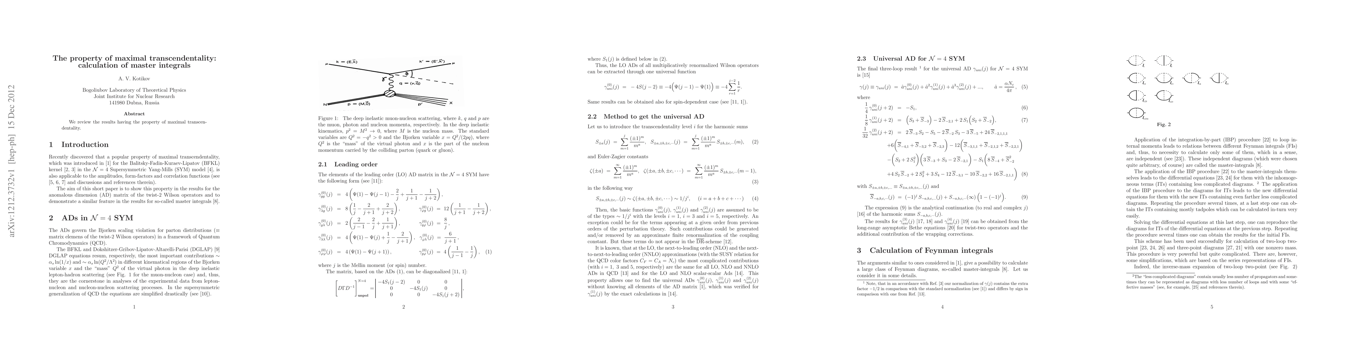Summary: This paper reviews results characterized by maximal transcendentality, focusing on the calculation of master integrals within this context. It highlights the properties and implications of these transcendentally maximal results.