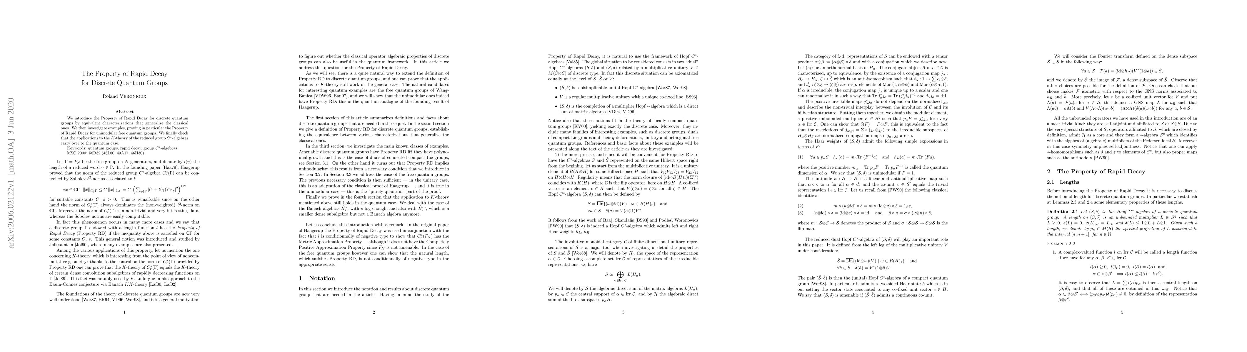 This paper introduces the Property of Rapid Decay for discrete quantum groups, providing generalized classical characterizations and proving its validity for unimodular free quantum groups. It also extends applications to the K-theory of reduced group C*-algebras in the quantum context.