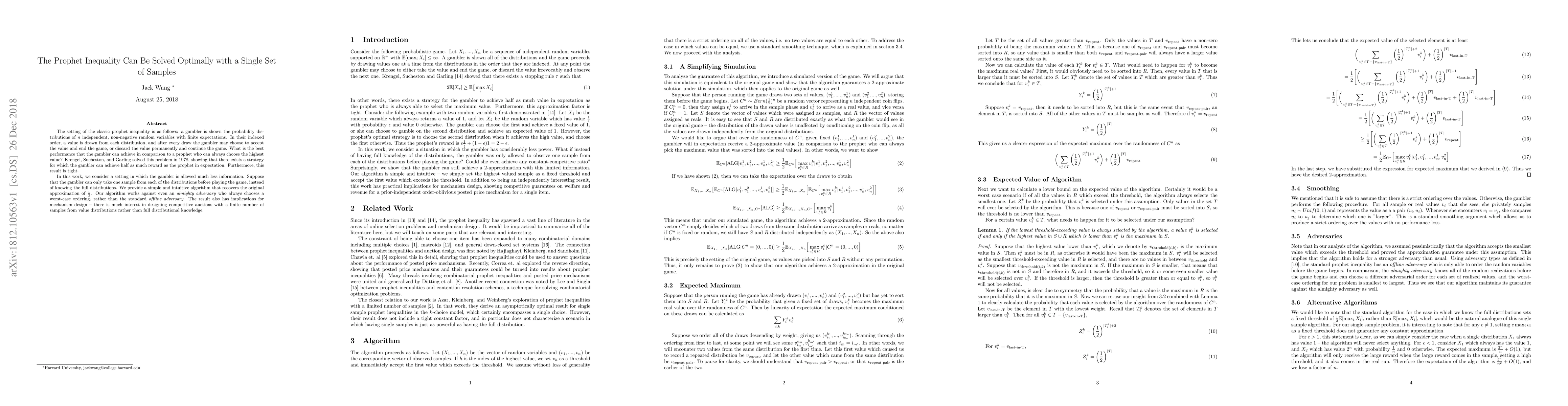 The setting of the classic prophet inequality is as follows: a gambler is shown the probability distributions of $n$ independent, non-negative random variables with finite expectations. In their indexed order, a value is drawn from each distribution, and after every draw the gambler may choose to accept the value and end the game, or discard the value permanently and continue the game. What is the best performance that the gambler can achieve in comparison to a prophet who can always choose the highest value? Krengel, Sucheston, and Garling solved this problem in 1978, showing that there exists a strategy for which the gambler can achieve half as much reward as the prophet in expectation. Furthermore, this result is tight. In this work, we consider a setting in which the gambler is allowed much less information. Suppose that the gambler can only take one sample from each of the distributions before playing the game, instead of knowing the full distributions. We provide a simple and intuitive algorithm that recovers the original approximation of $\frac{1}{2}$. Our algorithm works against even an almighty adversary who always chooses a worst-case ordering, rather than the standard offline adversary. The result also has implications for mechanism design -- there is much interest in designing competitive auctions with a finite number of samples from value distributions rather than full distributional knowledge.
