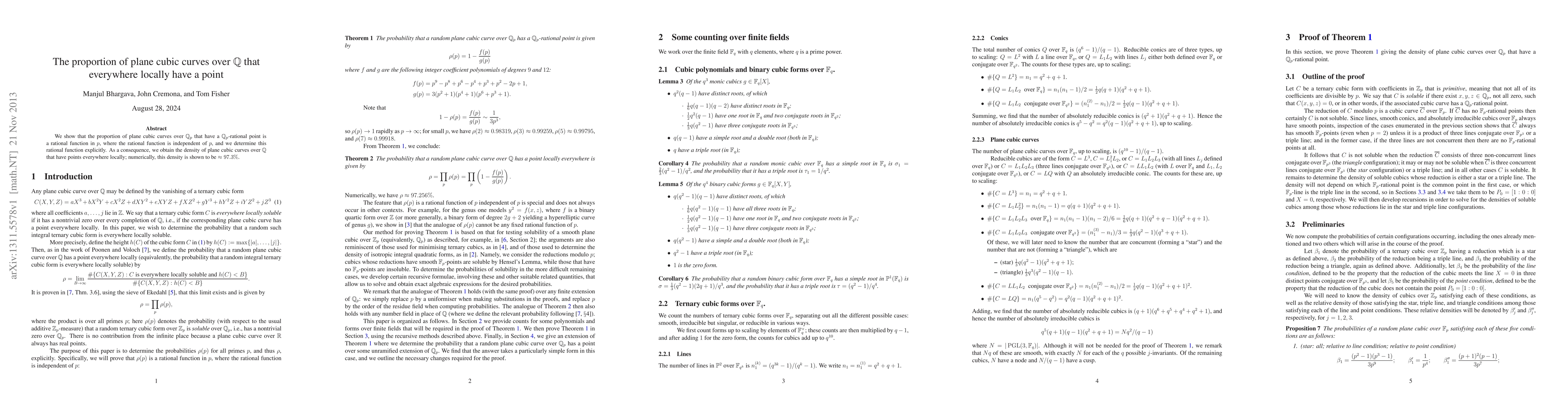 The paper determines the rational function that represents the proportion of plane cubic curves over ${\mathbb Q}_p$ with ${\mathbb Q}_p$-rational points, independent of $p$, and finds that the density of such curves over ${\mathbb Q}$ is approximately 97.3%.