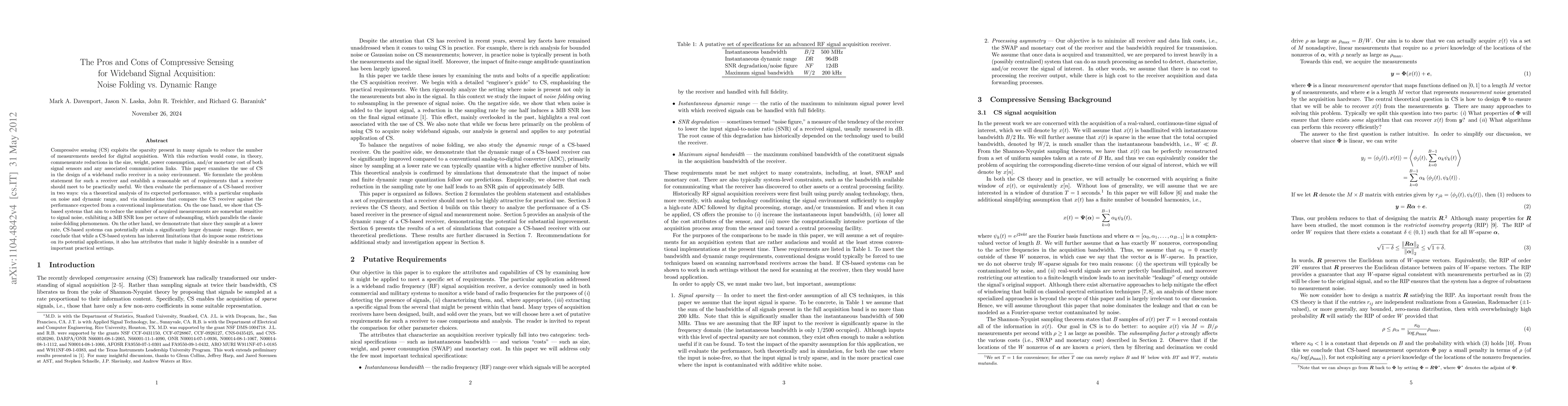 Compressive sensing (CS) exploits the sparsity present in many signals to reduce the number of measurements needed for digital acquisition. With this reduction would come, in theory, commensurate reductions in the size, weight, power consumption, and/or monetary cost of both signal sensors and any associated communication links. This paper examines the use of CS in the design of a wideband radio receiver in a noisy environment. We formulate the problem statement for such a receiver and establish a reasonable set of requirements that a receiver should meet to be practically useful. We then evaluate the performance of a CS-based receiver in two ways: via a theoretical analysis of its expected performance, with a particular emphasis on noise and dynamic range, and via simulations that compare the CS receiver against the performance expected from a conventional implementation. On the one hand, we show that CS-based systems that aim to reduce the number of acquired measurements are somewhat sensitive to signal noise, exhibiting a 3dB SNR loss per octave of subsampling, which parallels the classic noise-folding phenomenon. On the other hand, we demonstrate that since they sample at a lower rate, CS-based systems can potentially attain a significantly larger dynamic range. Hence, we conclude that while a CS-based system has inherent limitations that do impose some restrictions on its potential applications, it also has attributes that make it highly desirable in a number of important practical settings.