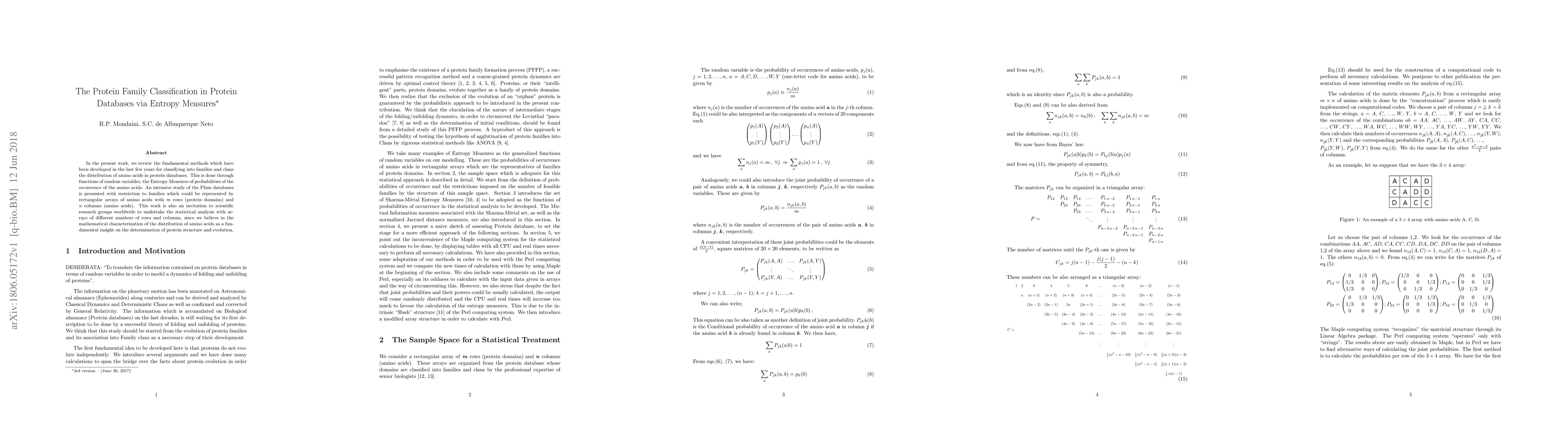 In the present work, we review the fundamental methods which have been developed in the last few years for classifying into families and clans the distribution of amino acids in protein databases. This is done through functions of random variables, the Entropy Measures of probabilities of occurrence of the amino acids. An intensive study of the Pfam databases is presented with restrictions to families which could be represented by rectangular arrays of amino acids with m rows (protein domains) and n columns (amino acids). This work is also an invitation to scientific research groups worldwide to undertake the statistical analysis with different numbers of rows and columns since we believe in the mathematical characterization of the distribution of amino acids as a fundamental insight on the determination of protein structure and evolution.