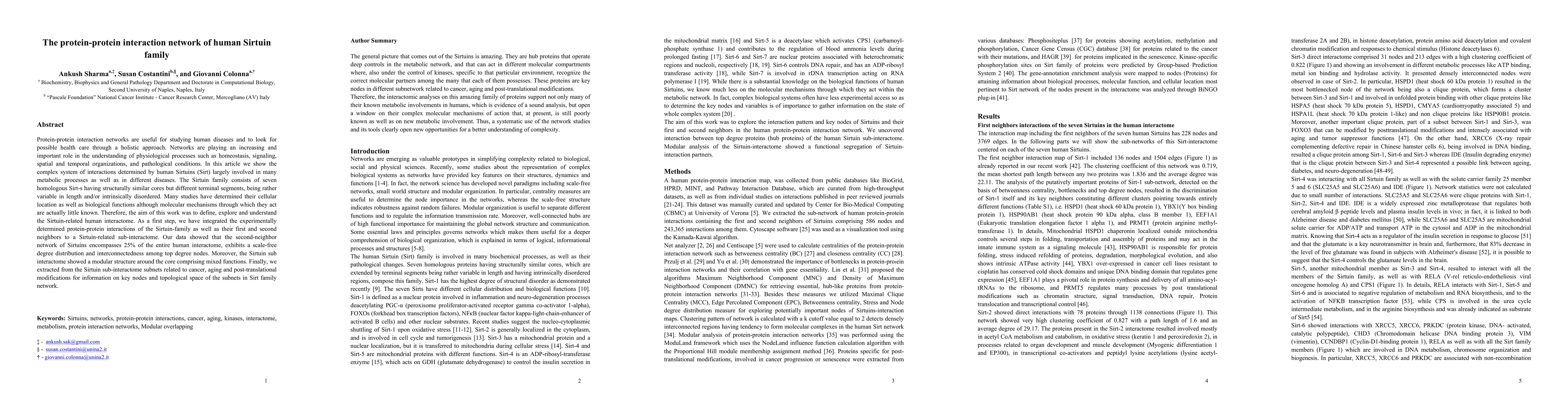 This paper explores the protein-protein interaction network of the human Sirtuin family, revealing its complex interactions and modular structure. The Sirtuin sub-interactome, which includes second-neighbor interactions, represents 25% of the entire human interactome and shows scale-free distribution and interconnectedness, with extracted subnets related to cancer, aging, and post-translational modifications.