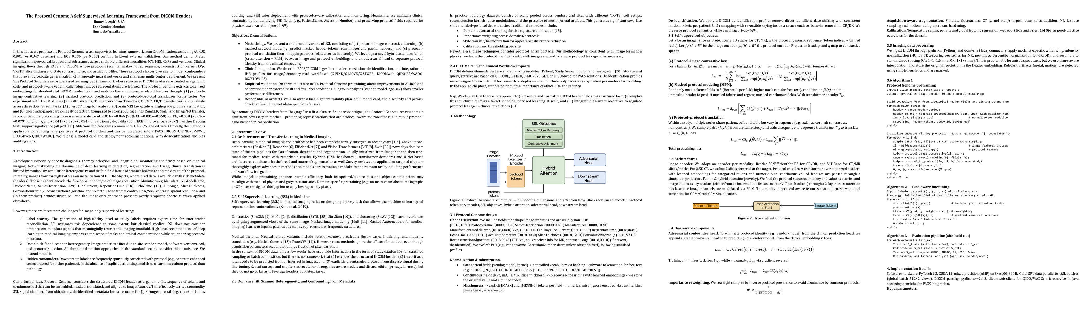 In this paper, we introduce the Protocol Genome, a self-supervised learning system that learns correlations from DICOM headers and achieves AUROC 0.901 (vs 0.847 baseline) and ECE 0.036 (vs 0.058) on fully held-out external validation. Our method also improves calibration and robustness across modalities (CT, MRI, CXR) and vendors. Clinical imaging is funneled through PACS/DICOM, where procedure choices (scanner make/model, sequence, kernel, kVp, TR/TE, and slice thickness) have consequences for contrast, noise, and artifact. These latent confounders impede the generalization of image-only networks across sites. We consider structured DICOM headers as a label and learn protocol-aware but clinically robust image representations. Protocol Genome obtains tokenized embeddings of de-identified header fields and models them along with image features using: (1) protocol-image contrastive learning, (2) masked protocol prediction, and (3) protocol-protocol translation. With 1.26M studies (7 health systems, 31 scanners, 3 vendors; CT, MR, CR/DR), we experiment on: (A) chest CT triage for PE, (B) brain MRI glioma grading, and (C) chest radiograph cardiomegaly detection. Relative to strong SSL baselines (SimCLR, MAE) as well as ImageNet transfer, Protocol Genome (+0.046: PE, +0.058: glioma, +0.041: cardiomegaly) is associated with higher external AUROC; 25-37% calibration improvements are obtained (p < 0.01, DeLong tests). While the gains may be task-dependent, they are preserved with 10-20% of labeled data. From a clinical point of view, the technique reduces false positives at protocol borders and is applicable in a PACS (DICOM C-FIND/C-MOVE, DICOMweb QIDO/WADO). We publish a model card and deployment guide, complete with both de-identification and bias audits.