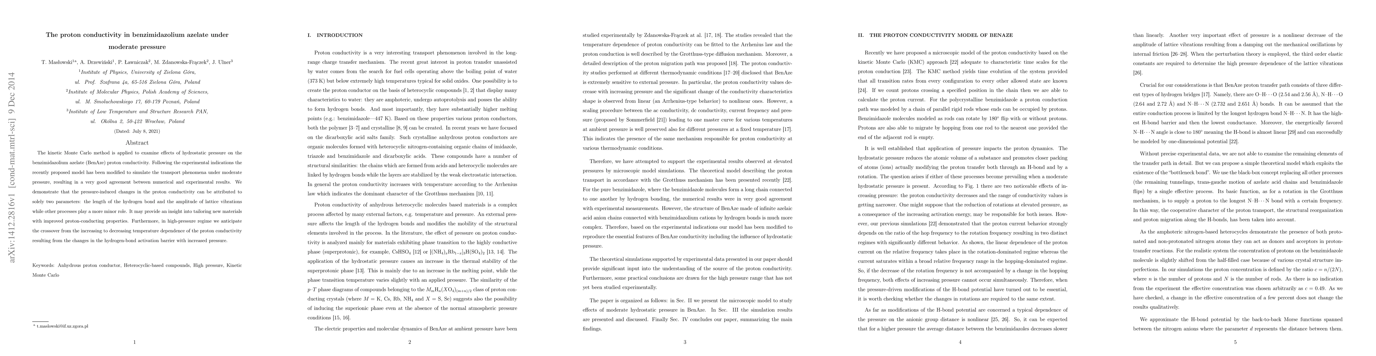 This study uses the kinetic Monte Carlo method to investigate how hydrostatic pressure affects proton conductivity in benzimidazolium azelate, finding that pressure-induced changes primarily depend on the hydrogen bond length and lattice vibrations. The results suggest potential for developing new materials with enhanced proton-conducting properties.