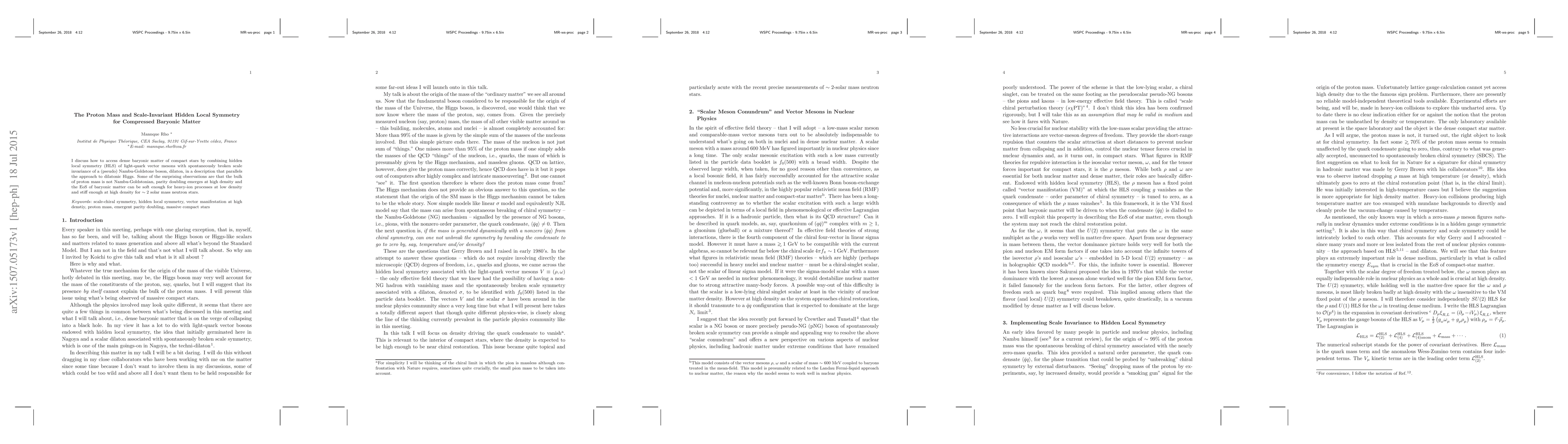 I discuss how to access dense baryonic matter of compact stars by combining hidden local symmetry (HLS) of light-quark vector mesons with spontaneously broken scale invariance of a (pseudo) Nambu-Goldstone boson, dilaton, in a description that parallels the approach to dilatonic Higgs. Some of the surprising observations are that the bulk of proton mass is not Nambu-Goldstonian, parity doubling emerges at high density and the EoS of baryonic matter can be soft enough for heavy-ion processes at low density and stiff enough at high density for $\sim 2$ solar mass neutron stars.