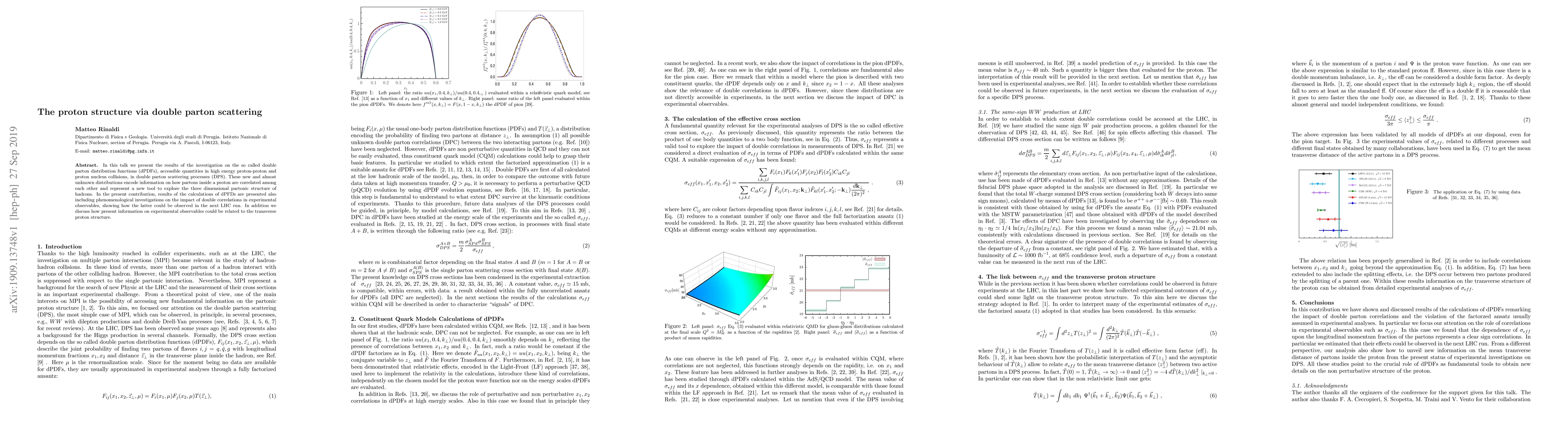 In this talk we present the results of the investigation on the so called double parton distribution functions (dPDFs), accessible quantities in high energy proton-proton and proton nucleus collisions, in double parton scattering processes (DPS). These new and almost unknown distributions encode information on how partons inside a proton are correlated among each other and represent a new tool to explore the three dimensional partonic structure of hadrons. In the present contribution, results of the calculations of dPFDs are presented also including phenomenological investigations on the impact of double correlations in experimental observables, showing how the latter could be observed in the next LHC run. In addition we discuss how present information on experimental observables could be related to the transverse proton structure.
