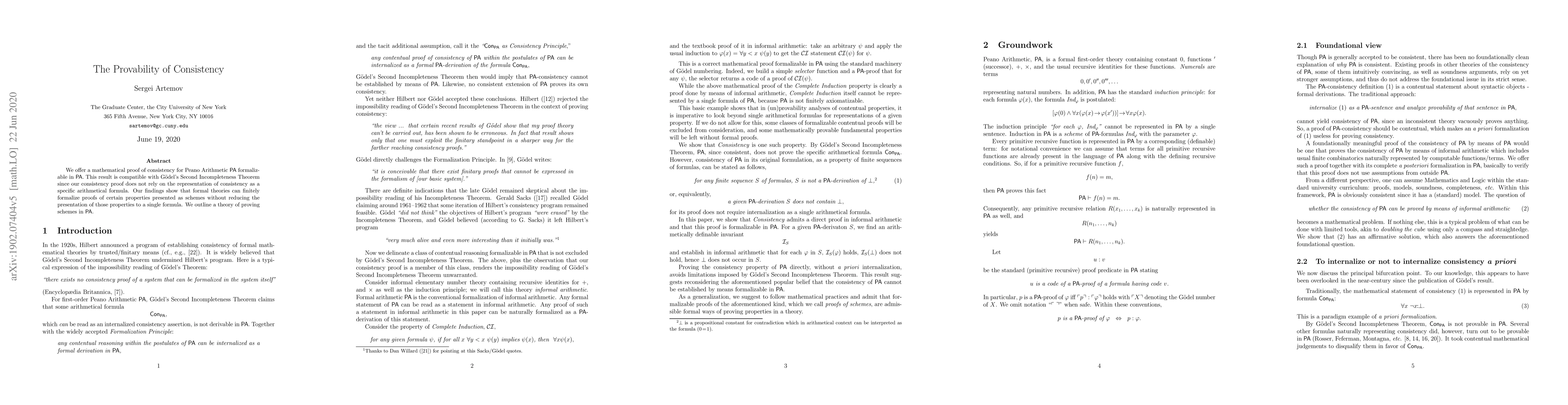 We offer a mathematical proof of consistency for Peano Arithmetic PA formalizable in PA. This result is compatible with Goedel's Second Incompleteness Theorem since our consistency proof does not rely on the representation of consistency as a specific arithmetical formula. Our findings show that formal theories can finitely formalize proofs of certain properties presented as schemes without reducing the presentation of those properties to a single formula. We outline a theory of proving schemes in PA.