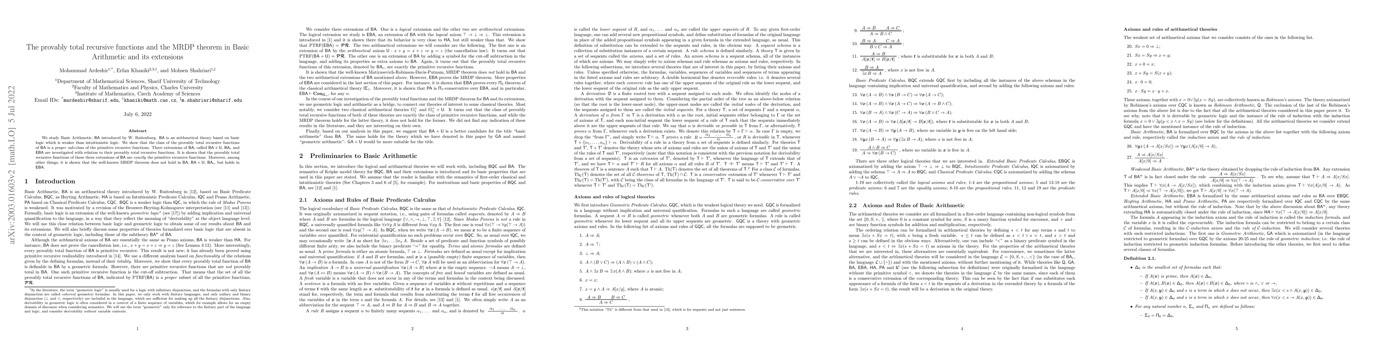 This paper investigates the class of provably total recursive functions within Basic Arithmetic (BA) and its extensions, demonstrating that BA's provably total recursive functions are a proper subset of primitive recursive functions. It further shows that three extensions of BA—BA+U, BA_c, and EBA—have exactly the same provably total recursive functions as primitive recursive functions, and that the MRDP theorem holds only in EBA.