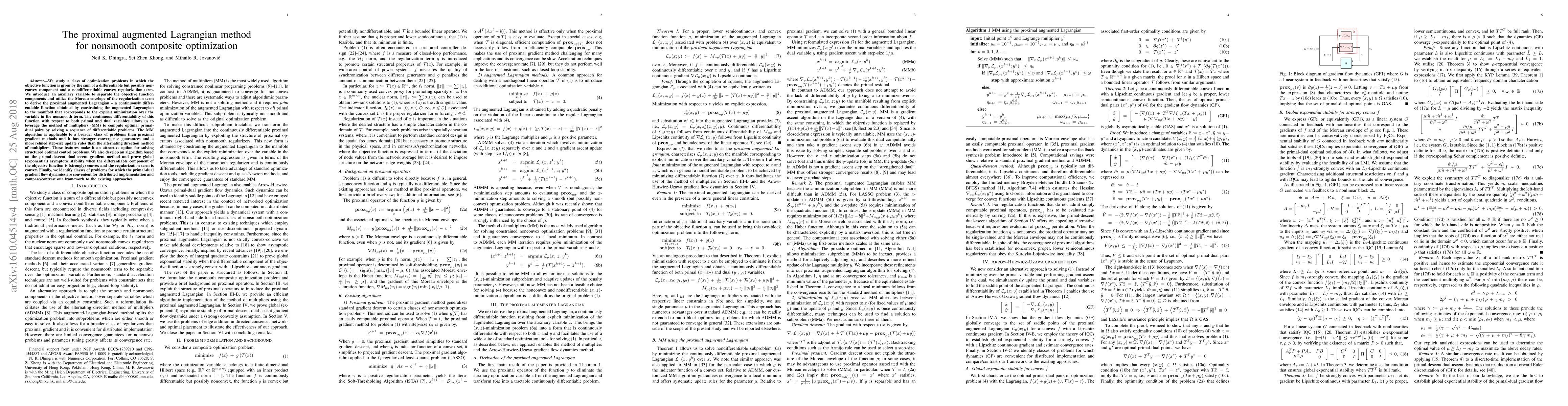 We study a class of optimization problems in which the objective function is given by the sum of a differentiable but possibly nonconvex component and a nondifferentiable convex regularization term. We introduce an auxiliary variable to separate the objective function components and utilize the Moreau envelope of the regularization term to derive the proximal augmented Lagrangian $-$ a continuously differentiable function obtained by constraining the augmented Lagrangian to the manifold that corresponds to the explicit minimization over the variable in the nonsmooth term. The continuous differentiability of this function with respect to both primal and dual variables allows us to leverage the method of multipliers (MM) to compute optimal primal-dual pairs by solving a sequence of differentiable problems. The MM algorithm is applicable to a broader class of problems than proximal gradient methods and it has stronger convergence guarantees and a more refined step-size update rules than the alternating direction method of multipliers. These features make it an attractive option for solving structured optimal control problems. We also develop an algorithm based on the primal-descent dual-ascent gradient method and prove global (exponential) asymptotic stability when the differentiable component of the objective function is (strongly) convex and the regularization term is convex. Finally, we identify classes of problems for which the primal-dual gradient flow dynamics are convenient for distributed implementation and compare/contrast our framework to the existing approaches.
