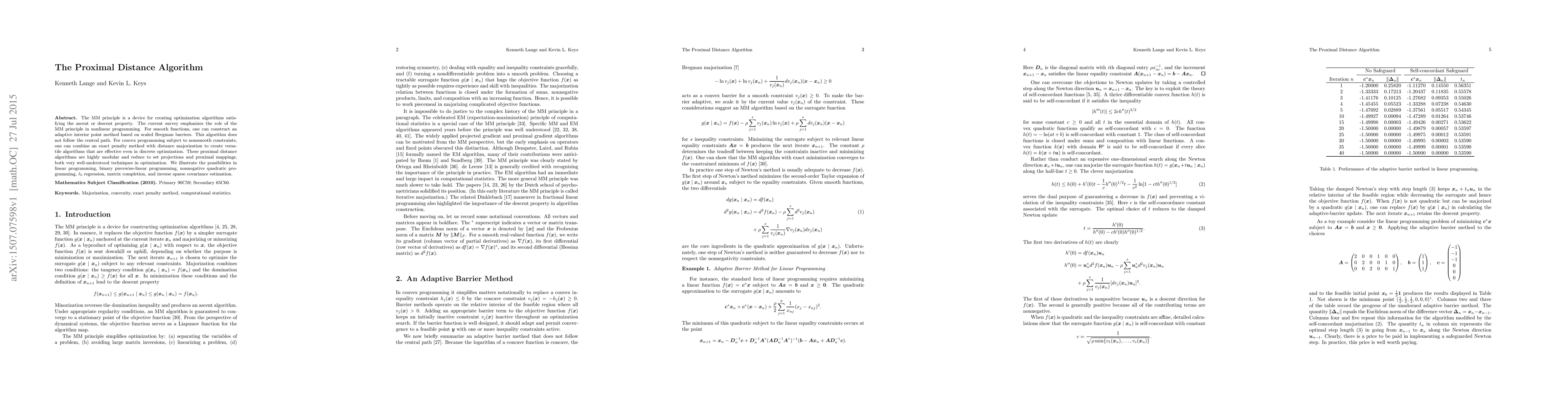 The MM principle is used to develop optimization algorithms for nonlinear and convex programming, especially for nonsmooth constraints. Proximal distance algorithms, which are modular and effective in various applications, combine exact penalty methods with distance majorization.