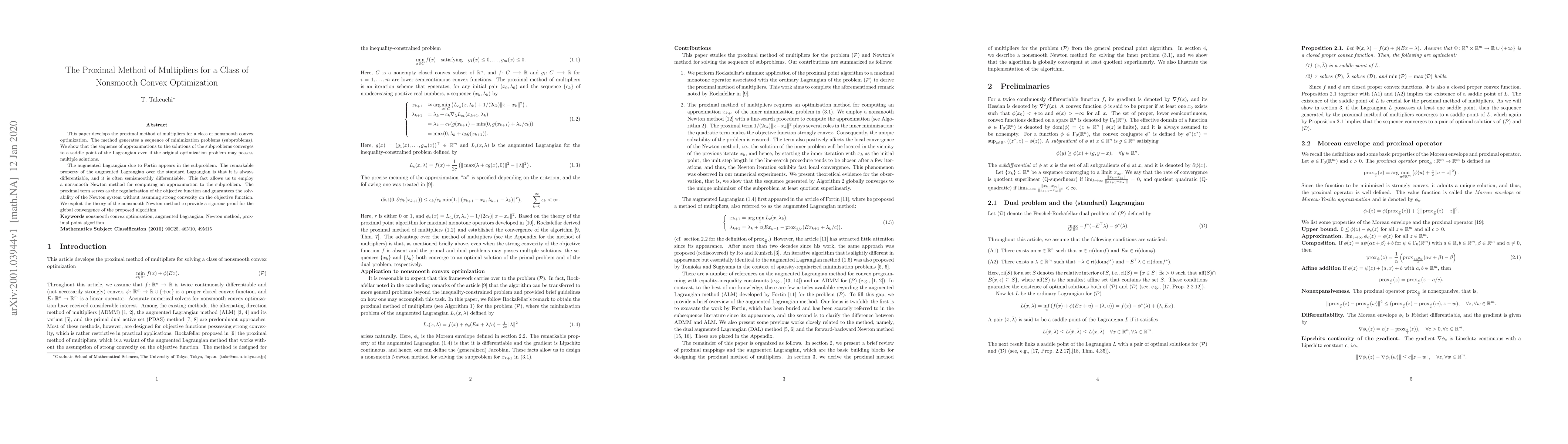 This paper introduces the proximal method of multipliers for nonsmooth convex optimization, demonstrating convergence to a saddle point via a sequence of differentiable subproblems. The method leverages the augmented Lagrangian, ensuring differentiability and semismoothness, enabling a nonsmooth Newton approach and proving global convergence.