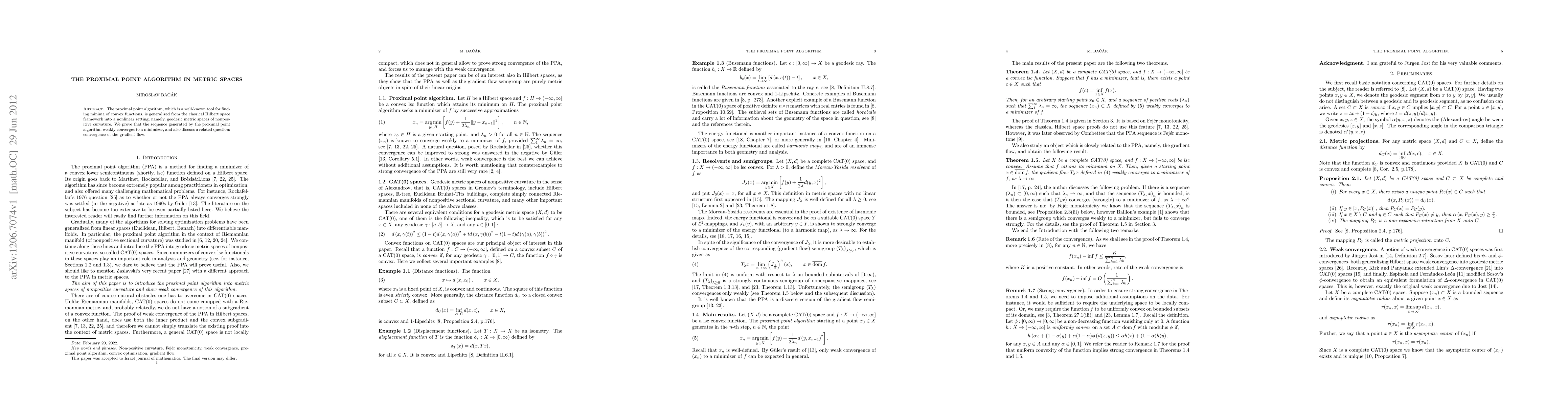The proximal point algorithm, which is a well-known tool for finding minima of convex functions, is generalized from the classical Hilbert space framework into a nonlinear setting, namely, geodesic metric spaces of nonpositive curvature. We prove that the sequence generated by the proximal point algorithm weakly converges to a minimizer, and also discuss a related question: convergence of the gradient flow.