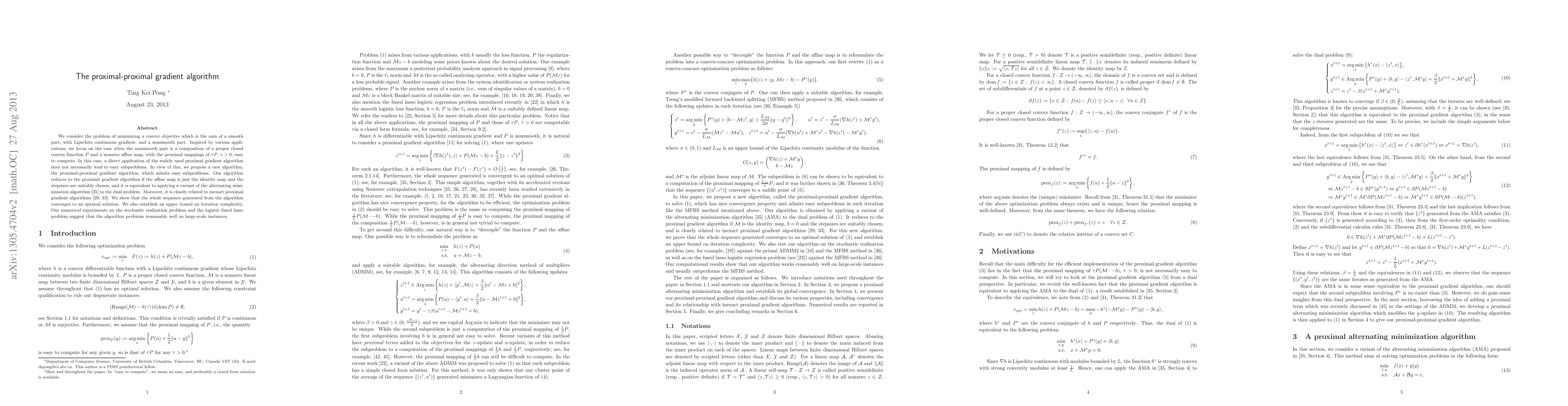 We consider the problem of minimizing a convex objective which is the sum of a smooth part, with Lipschitz continuous gradient, and a nonsmooth part. Inspired by various applications, we focus on the case when the nonsmooth part is a composition of a proper closed convex function P and a nonzero affine map, with the proximal mappings of \tau P, \tau > 0, easy to compute. In this case, a direct application of the widely used proximal gradient algorithm does not necessarily lead to easy subproblems. In view of this, we propose a new algorithm, the proximal-proximal gradient algorithm, which admits easy subproblems. Our algorithm reduces to the proximal gradient algorithm if the affine map is just the identity map and the stepsizes are suitably chosen, and it is equivalent to applying a variant of the alternating minimization algorithm [35] to the dual problem. Moreover, it is closely related to inexact proximal gradient algorithms [29,33]. We show that the whole sequence generated from the algorithm converges to an optimal solution. We also establish an upper bound on iteration complexity. Our numerical experiments on the stochastic realization problem and the logistic fused lasso problem suggest that the algorithm performs reasonably well on large-scale instances.