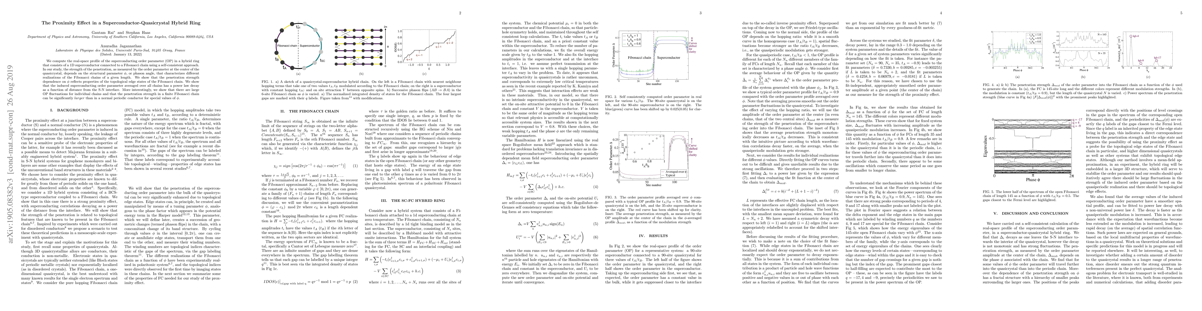 We compute the real-space profile of the superconducting order parameter (OP) in a hybrid ring that consists of a 1D superconductor connected to a Fibonacci chain using a self-consistent approach. In our study, the strength of the penetration, as measured by the order parameter at the center of the quasicrystal, depends on the structural parameter $\phi$, or phason angle, that characterizes different realizations of the Fibonacci chains of a given length. We show that the penetration strength dependence on $\phi$ reflects properties of the topological edge states of the Fibonacci chain. We show that the induced superconducting order parameter averaged over all chains has a power law decay as a function of distance from the S-N interface. More interestingly, we show that there are large OP fluctuations for individual chains and that the penetration strength in a finite Fibonacci chain can be significantly $larger$ than in a normal periodic conductor for special values of $\phi$.
