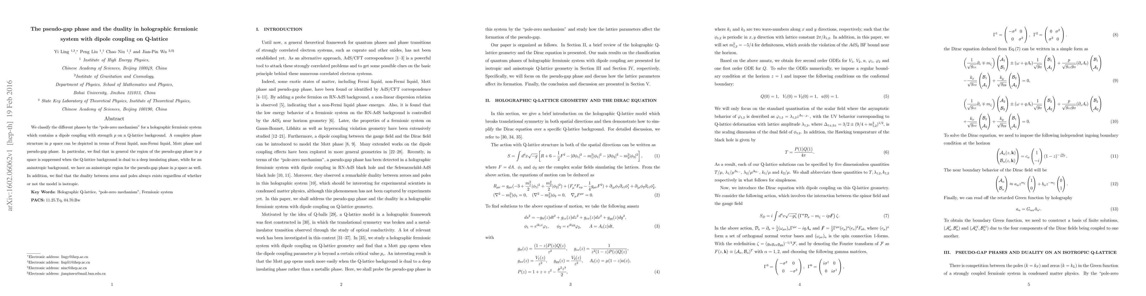This paper classifies phases in a holographic fermionic system with dipole coupling on a Q-lattice, identifying Fermi liquid, non-Fermi liquid, Mott, and pseudo-gap phases. It reveals that the pseudo-gap phase is suppressed in deep insulating Q-lattice backgrounds, and an anisotropic region for the pseudo-gap phase exists in anisotropic backgrounds. The study also confirms the duality between zeros and poles in the system, irrespective of isotropy.
