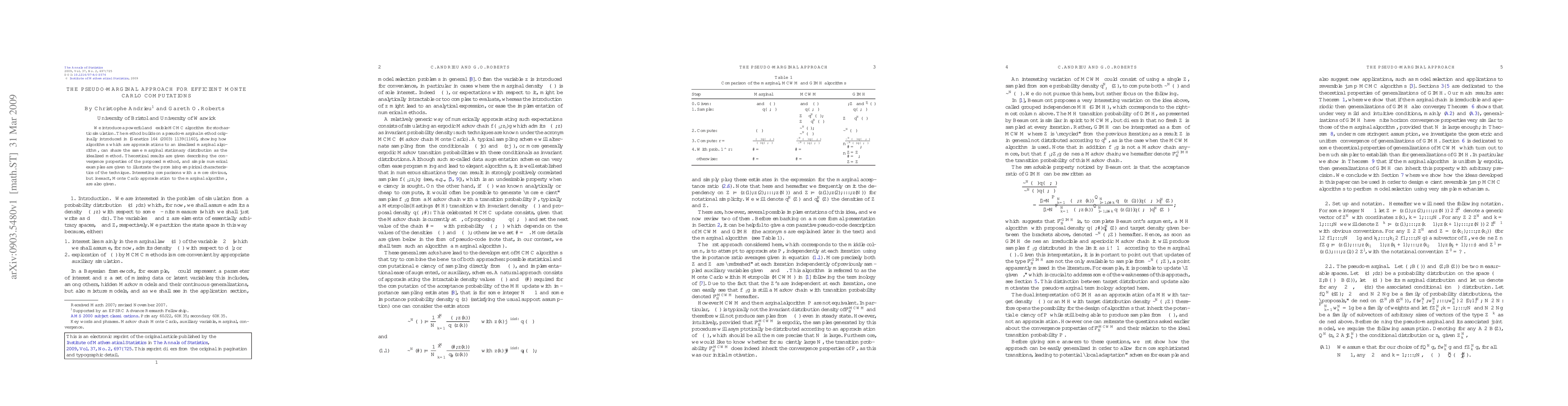 The pseudo-marginal approach is presented as a flexible MCMC algorithm for efficient Monte Carlo computations, sharing the same marginal stationary distribution as an idealized method, with theoretical convergence properties and promising empirical results demonstrated through numerical examples.