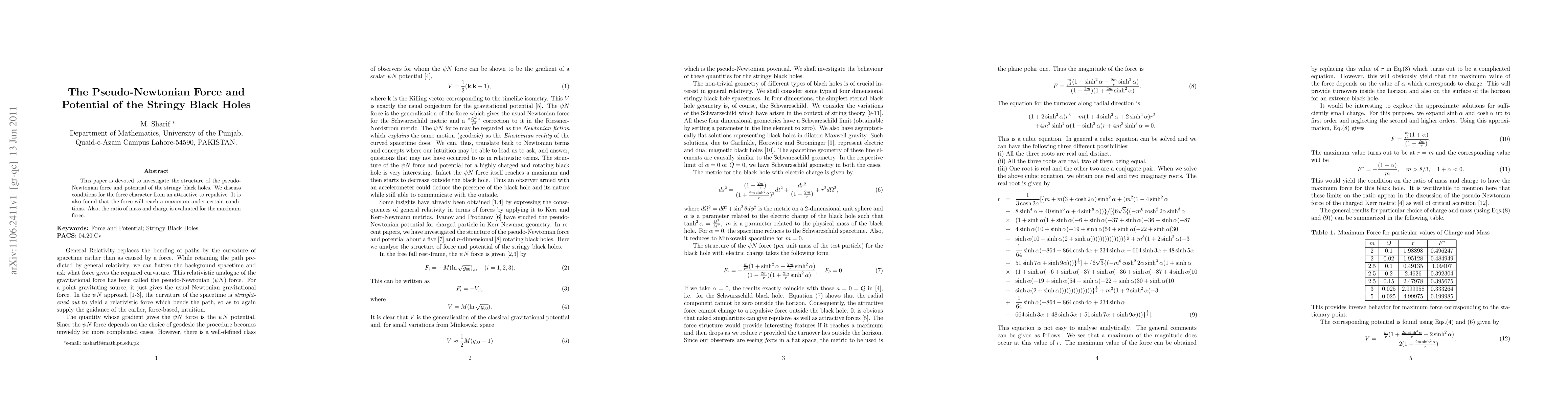 This paper explores the pseudo-Newtonian force and potential of stringy black holes, examining how the force transitions from attractive to repulsive and identifying conditions for its maximum value, along with evaluating the mass-to-charge ratio at this peak force.