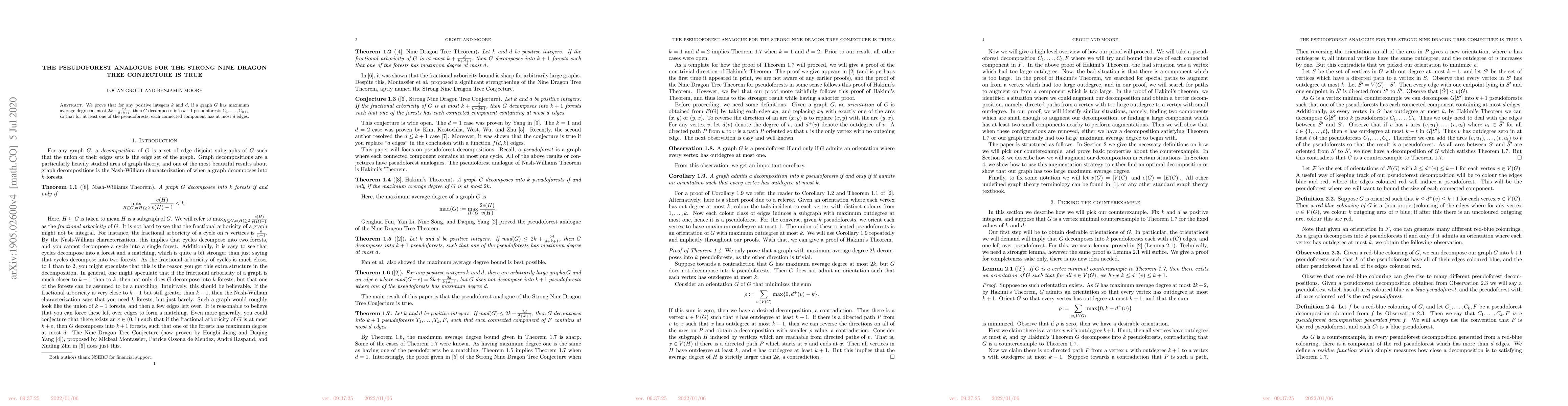 The paper proves the Pseudoforest analogue for the Strong Nine Dragon Tree Conjecture by demonstrating that for any positive integers k and d, a graph G with maximum average degree at most 2k + (2d)/(d+k+1) decomposes into k+1 pseudoforests C₁,...,Cₖ+₁, where one of the pseudoforests has each connected component C with e(C) ≤ d.