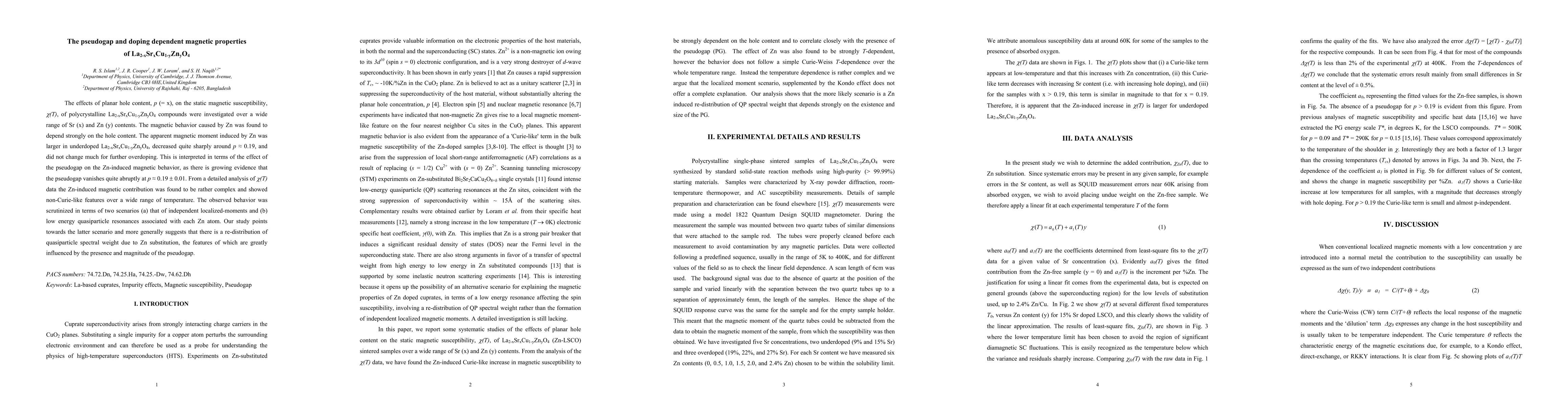 This study investigates the doping-dependent magnetic properties of La2-xSrxCu1-yZnyO4, finding that Zn-induced magnetism varies significantly with hole content, particularly vanishing around p ~ 0.19, suggesting a strong pseudogap influence. The magnetic behavior is complex and non-Curie-like, favoring a scenario of low-energy quasiparticle resonances over independent localized moments.