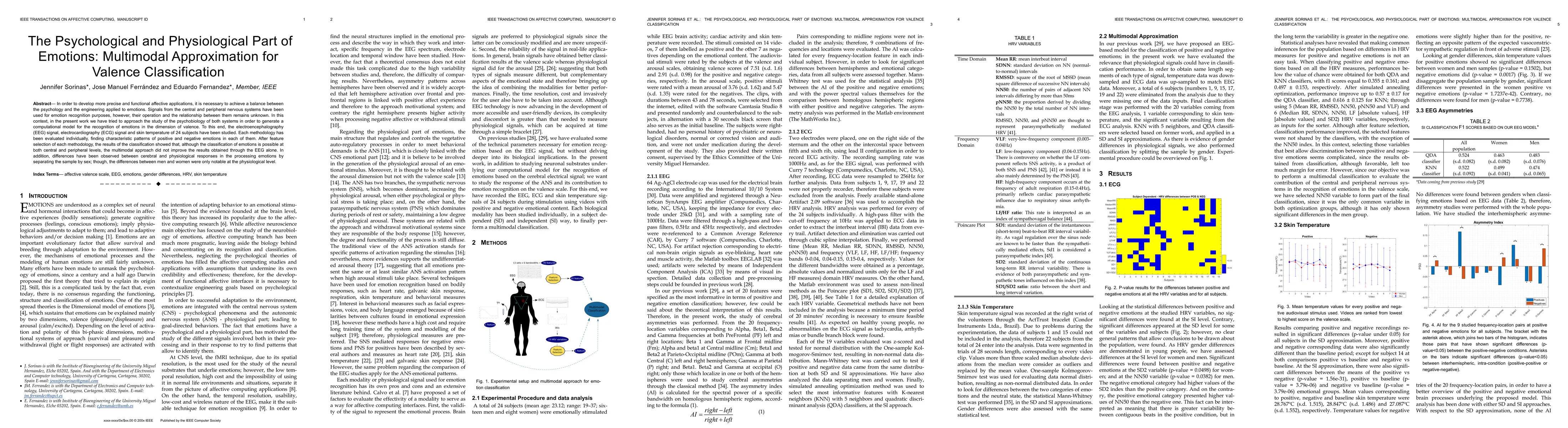 In order to develop more precise and functional affective applications, it is necessary to achieve a balance between the psychology and the engineering applied to emotions. Signals from the central and peripheral nervous systems have been used for emotion recognition purposes, however, their operation and the relationship between them remains unknown. In this context, in the present work we have tried to approach the study of the psychobiology of both systems in order to generate a computational model for the recognition of emotions in the dimension of valence. To this end, the electroencephalography (EEG) signal, electrocardiography (ECG) signal and skin temperature of 24 subjects have been studied. Each methodology has been evaluated individually, finding characteristic patterns of positive and negative emotions in each of them. After feature selection of each methodology, the results of the classification showed that, although the classification of emotions is possible at both central and peripheral levels, the multimodal approach did not improve the results obtained through the EEG alone. In addition, differences have been observed between cerebral and physiological responses in the processing emotions by separating the sample by sex; though, the differences between men and women were only notable at the physiological level.