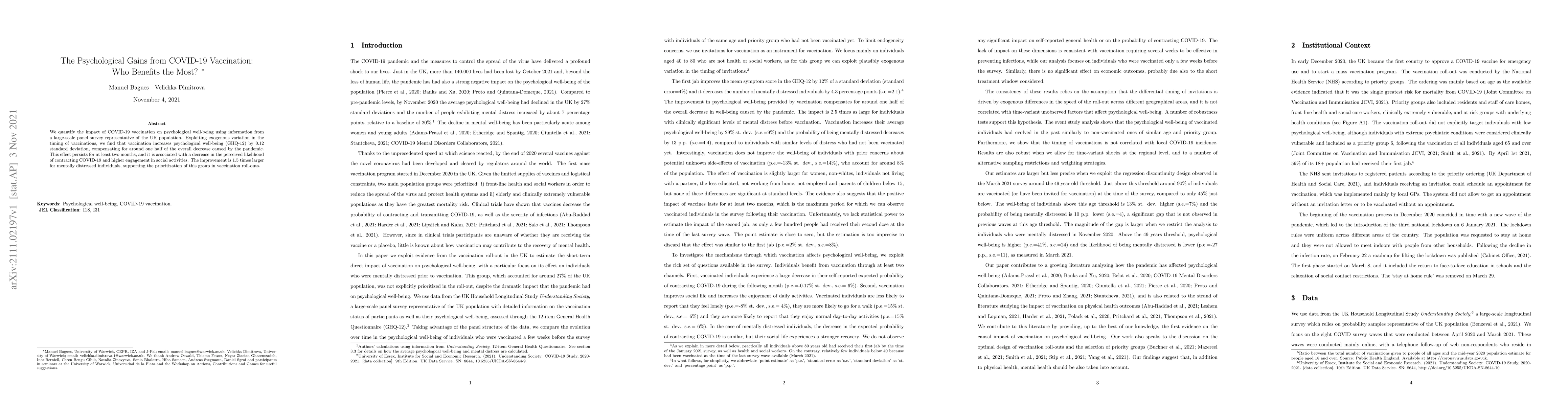 We quantify the impact of COVID-19 vaccination on psychological well-being using information from a large-scale panel survey representative of the UK population. Exploiting exogenous variation in the timing of vaccinations, we find that vaccination increases psychological well-being (GHQ-12) by 0.12 standard deviation, compensating for around one-half of the overall decrease caused by the pandemic. This effect persists for at least two months, and it is associated with a decrease in the perceived likelihood of contracting COVID-19 and higher engagement in social activities. The improvement is 1.5 times larger for mentally distressed individuals, supporting the prioritization of this group in vaccination roll-outs.